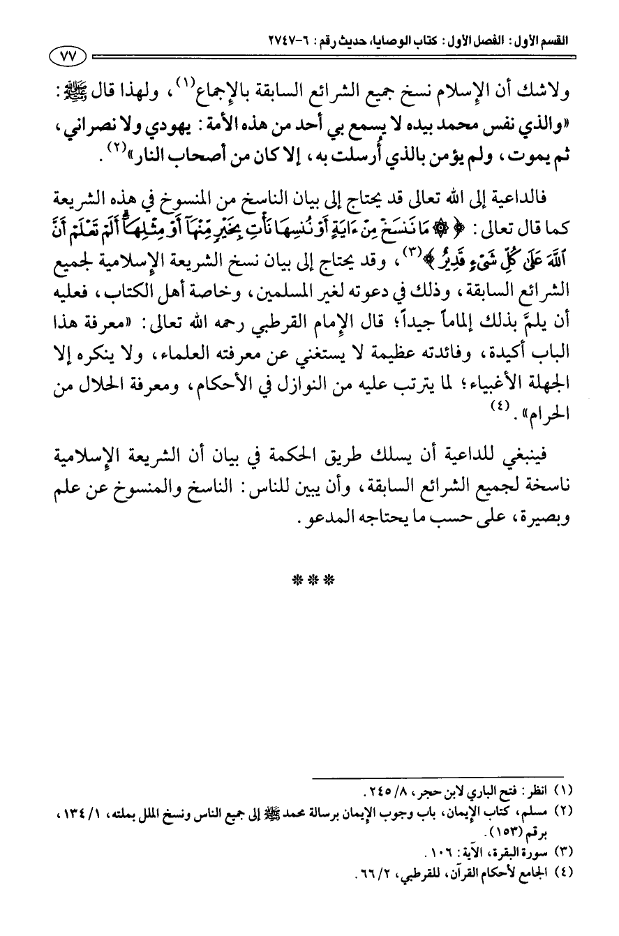 فالداعية إلى الله تعالى قد يحتاج إلى بيان الناسخ من المنسوخ في هذه الشريعة كما قال تعالى: {مَا نَنْسَخْ مِنْ آيَةٍ أَوْ نُنْسِهَا نَأْتِ بِخَيْرٍ مِنْهَا أَوْ مِثْلِهَا أَلَمْ تَعْلَمْ أَنَّ اللَّهَ عَلَى كُلِّ شَيْءٍ قَدِيرٌ} [البقرة: 106] (¬3) وقد يحتاج إلى بيان نسخ الشريعة الإِسلامية لجميع الشرائع السابقة، وذلك في دعوته لغير المسلمين، وخاصة أهل الكتاب، فعليه أن يلمَّ بذلك إلماما جيدا؛ قال الإمام القرطبي رحمه الله تعالى: " معرفة هذا الباب أكيدة، وفائدته عظيمة لا يستغني عن معرفته العلماء، ولا ينكره إلا الجهلة الأغبياء؛ لما يترتب عليه من النوازل في الأحكام، ومعرفة الحلال من الحرام " (¬4).