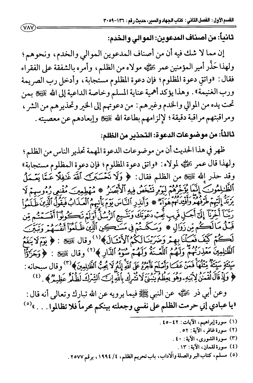 ثانيا: من أصناف المدعوين: الموالي والخدم: إن مما لا شك فيه أن من أصناف المدعوين الموالي والخدم، ونحوهم؛ ولهذا حَذَّر أمير المؤمنين عمر - رَضِيَ اللَّهُ عَنْهُ - مولاه من الظلم، وأمره بالشفقة على الفقراء فقال: واتقِ دعوة المظلوم؛ فإن دعوة المظلوم مستجابة، وأدخل رب الصريمة ورب الغنيمة ". وهذا يؤكد أهمية عناية المسلم وخاصة الداعية إلى الله - عز وجل - بمن تحت يده من الموالي والخدم وغيرهم: من دعوتهم إلى الخير وتحذيرهم من الشر، ومراقبتهم مراقبة دقيقة؛ لإِلزامهم بطاعة الله - عز وجل - وإبعادهم عن معصيته.