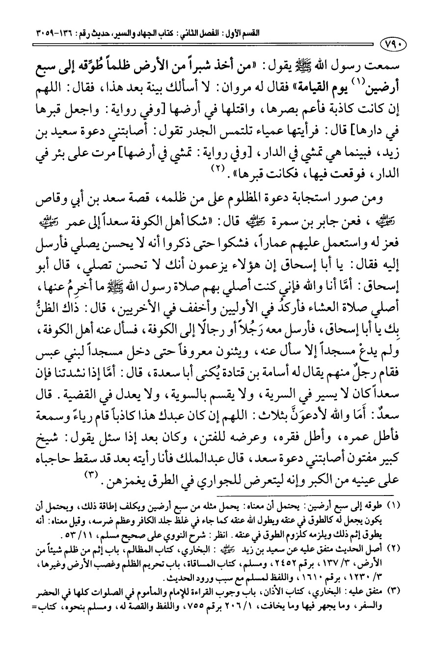 (¬2) أصل الحديث متفق عليه عن سعيد بن زيد رَضِيَ اللَّهُ عَنْهُ: البخاري، كتاب المظالم، باب إثم من ظلم شيئا من الأرض، 3/ 137، برقم 2452، ومسلم، كتاب المساقاة، باب تحريم الظلم وغصب الأرض وغيرها، 3/ 1230، برقم 1610، واللفظ لمسلم مع سبب ورود الحديث.