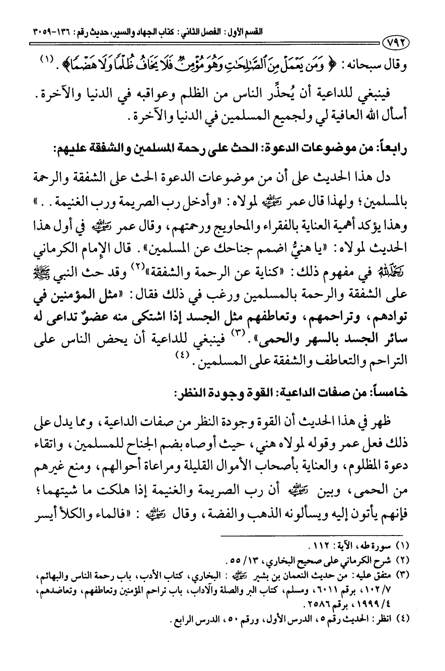رابعا: من موضوعات الدعوة: الحث على رحمة المسلمين والشفقة عليهم: دل هذا الحديث على أن من موضوعات الدعوة الحث على الشفقة والرحمة بالمسلمين؛ ولهذا قال عمر - رَضِيَ اللَّهُ عَنْهُ - لمولاه: " وأدخل رب الصريمة ورب الغنيمة. . " وهذا يؤكد أهمية العناية بالفقراء والمحاويج ورحمتهم، وقال عمر - رَضِيَ اللَّهُ عَنْهُ - في أول هذا الحديث لمولاه: " يا هنيُّ اضمم جناحك عن المسلمين ". قال الإمام الكرماني - رحمه الله - في مفهوم ذلك: " كناية عن الرحمة والشفقة " (¬2) وقد حث النبي - صَلَّى اللهُ عَلَيْهِ وَسَلَّم - على الشفقة والرحمة بالمسلمين ورغب في ذلك فقال: «مثل المؤمنين في توادهم، وتراحمهم، وتعاطفهم مثل الجسد إذا اشتكى منه عضو تداعى له سائر الجسد بالسهر والحمى» (¬3) فينبغي للداعية أن يحض الناس على التراحم والتعاطف والشفقة على المسلمين (¬4).