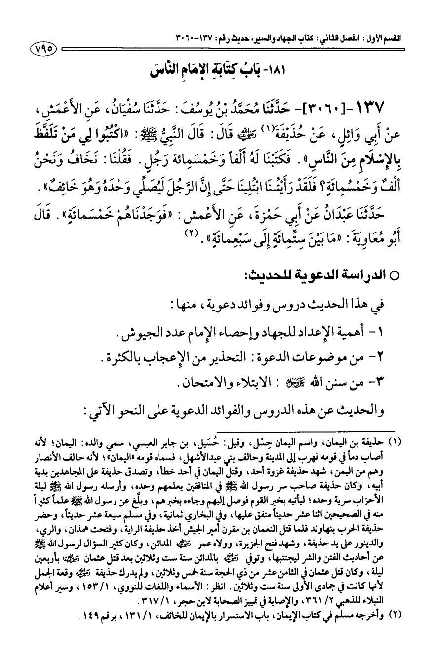 137 - [3060] حَدَّثَنَا مُحَمَّدُ بْنُ يُوسُفَ: حَدَّثَنَا سُفْيَانُ، عَنِ الأَعْمَشِ، عن أبي وائل، عن حذيفة (¬1) رَضِيَ اللَّهُ عَنْهُ قال: قال النبي صَلَّى اللهُ عَلَيْهِ وَسَلَّم: «اكتبوا لي من تلفظ بالإسلام من الناس» فكتبنا له ألفا وخمسمائة رجل. فقلنا: نخاف ونحن ألف وخمسمائة؟ فَلَقَدْ رَأَيْتُنَا ابْتُلِينَا حَتَّى إِنَّ الرَّجُلَ لَيُصَلِّي وَحْدَه وَهُوَ خَائِفٌ ".