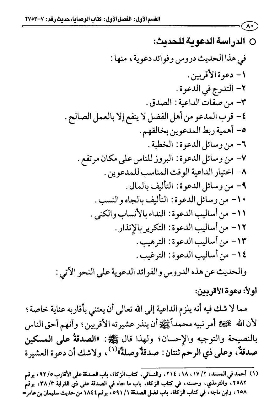 أولا: دعوة الأقربين: مما لا شك فيه أنه يلزم الداعية إلى الله تعالى أن يعتني بأقاربه عناية خاصة؛ لأن الله عز وجل أمر نبيه محمدا صلى الله عليه وسلم أن ينذر عشيرته الأقربين؛ وأنهم أحق الناس بالنصيحة والتوجيه والإِحسان؛ ولهذا قال صلى الله عليه وسلم: «الصدقة على المسكين صدقة، وعلى ذي الرحم ثنتان: صدقة وصلة» (¬1) ولا شك أن دعوة العشيرة