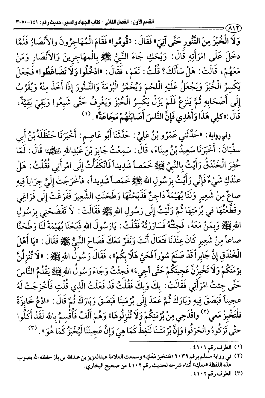 (¬2) في رواية مسلم برقم 2039 " فلتخبز مَعَكِ " وسمعت العلامة عبد العزيز بن عبد الله بن باز حفظه الله يصوب هذه اللفظة " معكِ " أثناء شرحه لحديث رقم 4102 من صحيح البخاري.
