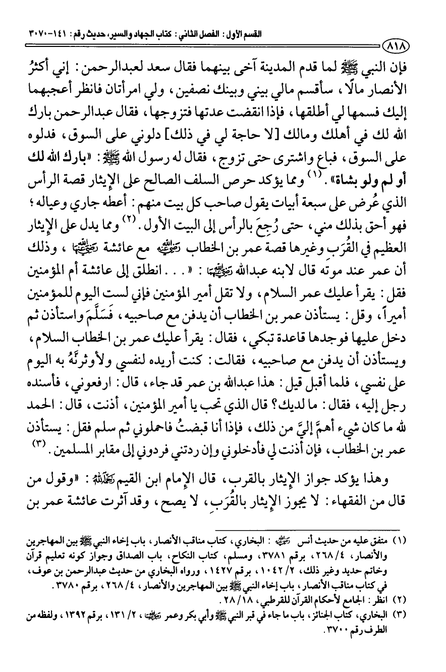 فإن النبي - صَلَّى اللهُ عَلَيْهِ وَسَلَّم - لما قدم المدينة آخى بينهما فقال سعد لعبد الرحمن: إني أكثرُ الأنصار مالًا، سأقسم مالي بيني وبينك نصفين، ولي امرأتان فانظر أعجبهما إليك فسمها لي أطلقها، فإذا انقضت عدتها فتزوجها، فقال عبد الرحمن بارك الله لك في أهلك ومالك [لا حاجة لي في ذلك] دلوني على السوق، فدلوه على السوق، فباع واشترى حتى تزوج، فقال له رسول الله - صَلَّى اللهُ عَلَيْهِ وَسَلَّم: «بارك الله لك أولم ولو بشاة» (¬1) ومما يؤكد حرص السلف الصالح على الإِيثار قصة الرأس الذي عُرض على سبعة أبيات يقول صاحب كل بيت منهم: أعطه جاري وعياله؛ فهو أحق بذلك مني، حتى رُجِعَ بالرأس إلى البيت الأول (¬2) ومما يدل على الإِيثار العظيم في القُرَبِ وغيرها قصة عمر بن الخطاب - رَضِيَ اللَّهُ عَنْهُ - مع عائشة رَضِيَ اللَّهُ عَنْهَا، وذلك أن عمر عند موته قال لابنه عبد الله - رضي الله عنهما: ". . . انطلق إلى عائشة أم المؤمنين فقل: يقرأ عليك عمر السلام، ولا تقل أمير المؤمنين فإني لست اليوم للمؤمنين أميرا، وقل: يستأذن عمر بن الخطاب أن يدفن مع صاحبيه، فَسَلَّمَ واستأذن ثم دخل عليها فوجدها قاعدة تبكي، فقال: يقرأ عليك عمر بن الخطاب السلام، ويستأذن أن يدفن مع صاحبيه، فقالت: كنت أريده لنفسي ولأوثرنَهُ به اليوم على نفسي، فلما أقبل قيل: هذا عبد الله بن عمر قد جاء، قال: ارفعوني، فأسنده رجل إليه، فقال: ما لديك؟ قال الذي تحب يا أمير المؤمنين، أذنت، قال: الحمد لله ما كان شيء أهمَّ إليَّ من ذلك، فإذا أنا قبضتُ فاحملوني ثم سلم فقل: يستأذن عمر بن الخطاب، فإن أذنت لي فأدخلوني وإن ردتني فردوني إلى مقابر المسلمين. (¬3).
