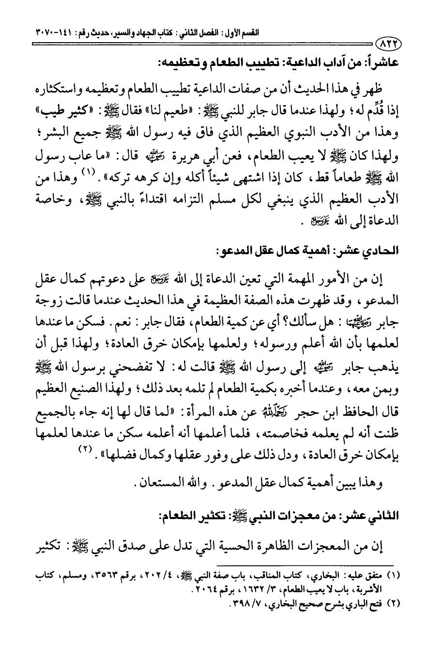 عاشرا: من آداب الداعية: تطييب الطعام وتعظيمه: ظهر في هذا الحديث أن من صفات الداعية تطييب الطعام وتعظيمه واستكثاره إذا قُدِّم له؛ ولهذا عندما قال جابر للنبي صَلَّى اللهُ عَلَيْهِ وَسَلَّم: " طعيم لنا " فقال صَلَّى اللهُ عَلَيْهِ وَسَلَّم: " كثير طيب "، وهذا من الأدب النبوي العظيم الذي فاق فيه رسول الله - صَلَّى اللهُ عَلَيْهِ وَسَلَّم - جميع البشر؛ ولهذا كان - صَلَّى اللهُ عَلَيْهِ وَسَلَّم - لا يعيب الطعام، فعن أبي هريرة - رَضِيَ اللَّهُ عَنْهُ - قال: «ما عاب رسول الله - صَلَّى اللهُ عَلَيْهِ وَسَلَّم - طعاما قط، كان إذا اشتهى شيئا أكله وإن كرهه تركه» (¬1) وهذا من الأدب العظيم الذي ينبغي لكل مسلم التزامه اقتداءً بالنبي صَلَّى اللهُ عَلَيْهِ وَسَلَّم، وخاصة الدعاة إلى الله - عز وجل.