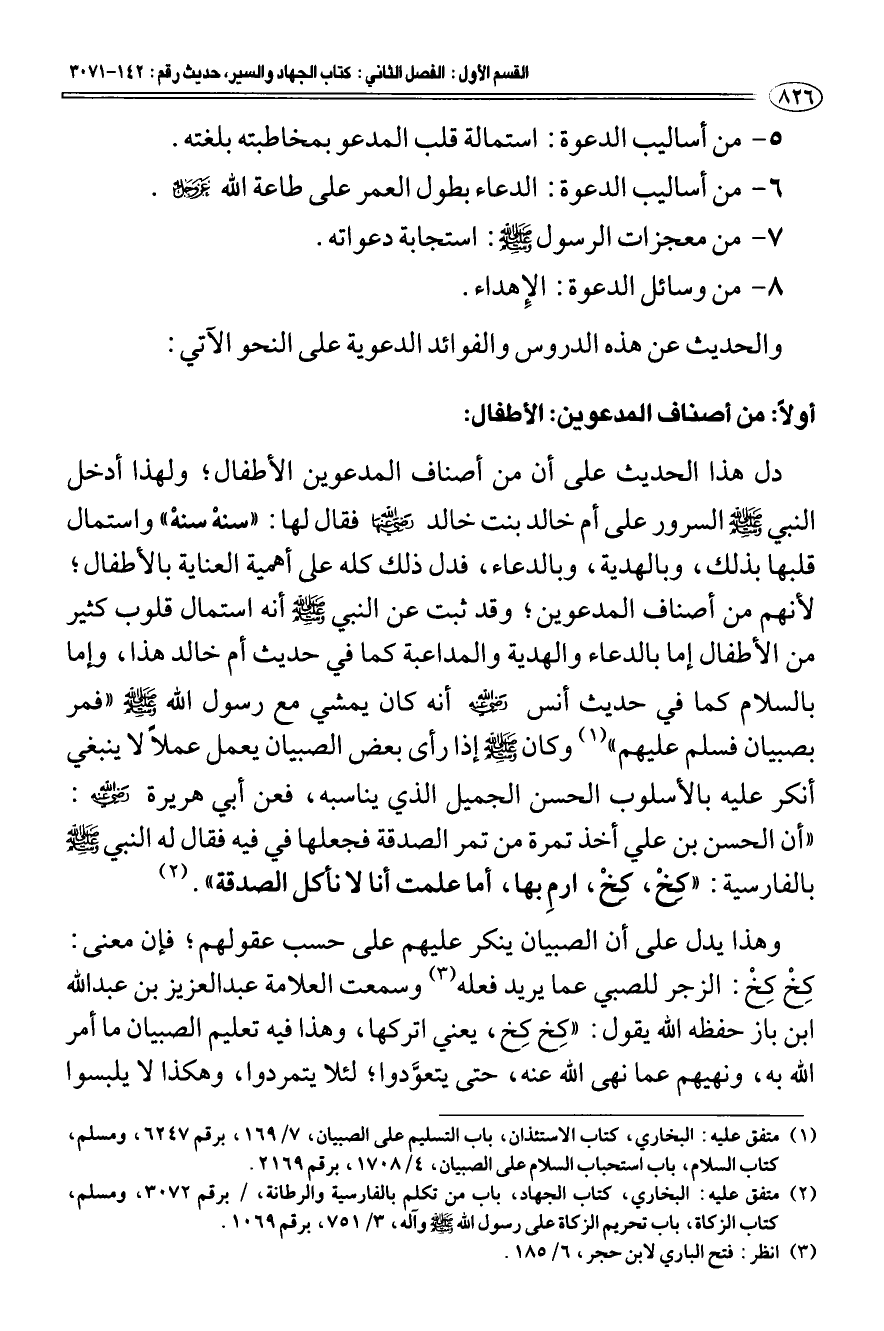 والحديث عن هذه الدروس والفوائد الدعوية على النحو الآتي: أولا: من أصناف المدعوين: الأطفال: دل هذا الحديث على أن من أصناف المدعوين الأطفال؛ ولهذا أدخل النبي - صَلَّى اللهُ عَلَيْهِ وَسَلَّم - السرور على أم خالد بنت خالد - رَضِيَ اللَّهُ عَنْهُما - فقال لها: " سنهْ سنهْ " واستمال قلبها بذلك، وبالهدية، وبالدعاء، فدل ذلك كله على أهمية العناية بالأطفال؛ لأنهم من أصناف المدعوين؛ وقد ثبت عن النبي - صَلَّى اللهُ عَلَيْهِ وَسَلَّم - أنه استمال قلوب كثير من الأطفال إما بالدعاء والهدية والمداعبة كما في حديث أم خالد هذا، وإما بالسلام كما في حديث أنس - رَضِيَ اللَّهُ عَنْهُ - «أنه كان يمشي مع رسول الله - صَلَّى اللهُ عَلَيْهِ وَسَلَّم - " فمر بصبيان فسلم عليهم» (¬1) وكان - صَلَّى اللهُ عَلَيْهِ وَسَلَّم - إذا رأى بعض الصبيان يعمل عملا لا ينبغي أنكر عليه بالأسلوب الحسن الجميل الذي يناسبه، فعن أبي هريرة رَضِيَ اللَّهُ عَنْهُ: «أن الحسن بن علي أخذ تمرة من تمر الصدقة فجعلها في فيه فقال له النبي - صَلَّى اللهُ عَلَيْهِ وَسَلَّم - بالفارسية: " كخْ، كخْ، ارمِ بها، أما علمت أنا لا نأكل الصدقة» (¬2).