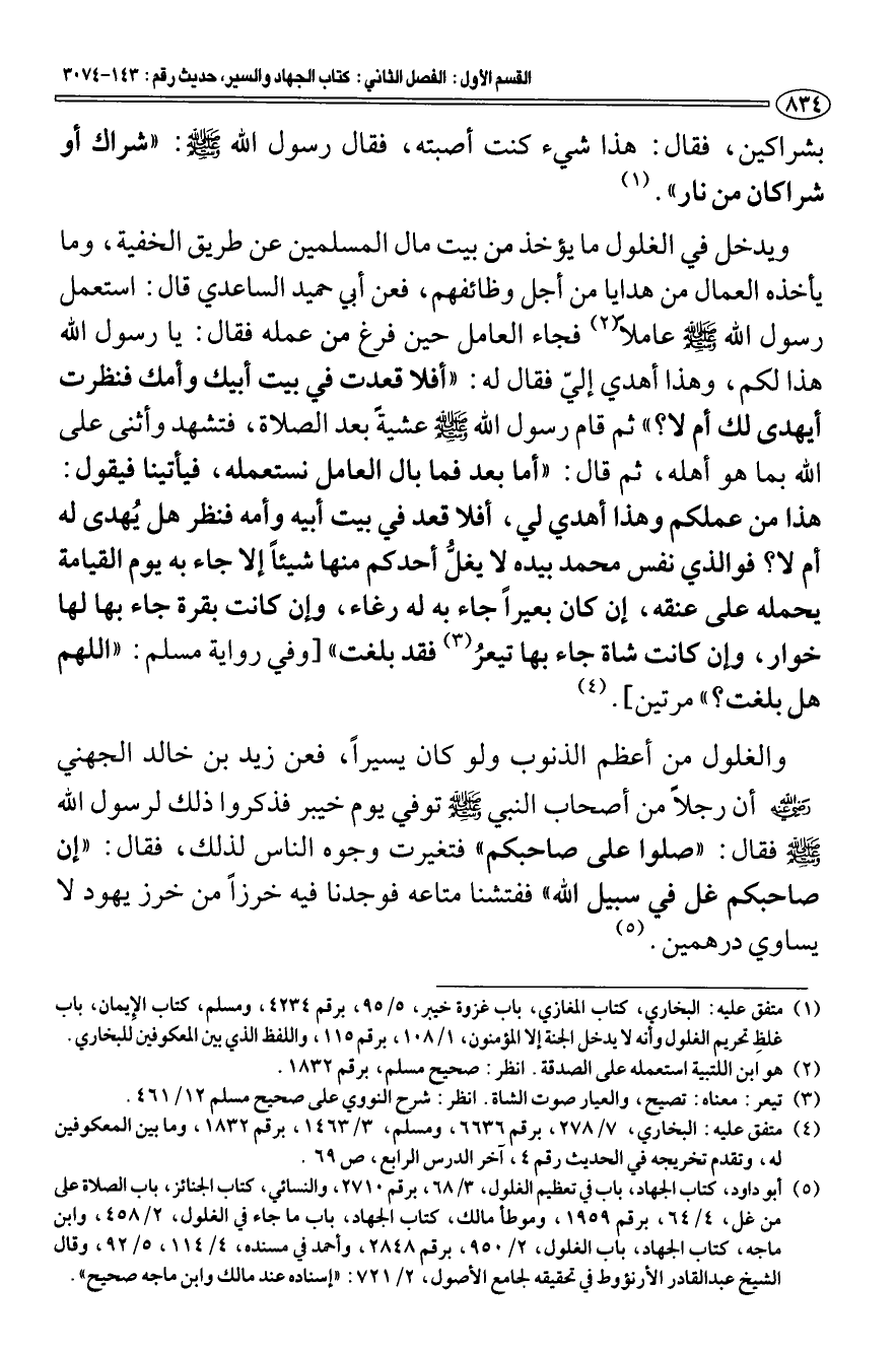 (¬5) أبو داود، كتاب الجهاد، باب في تعظيم الغلول، 3/ 68، برقم 2710، والنسائي، كتاب الجنائز، باب الصلاة على من غل، 4/ 64، برقم 1959، وموطأ مالك، كتاب الجهاد، باب ما جاء في الغلول، 2/ 458، وابن ماجه، كتاب الجهاد، باب الغلول، 2/ 950، برقم 2848، وأحمد في مسنده، 4/ 114، 5/ 92، وقال الشيخ عبد القادر الأرنؤوط في تحقيقه لجامع الأصول، 2/ 721: " إسناده عند مالك وابن ماجه صحيح ".