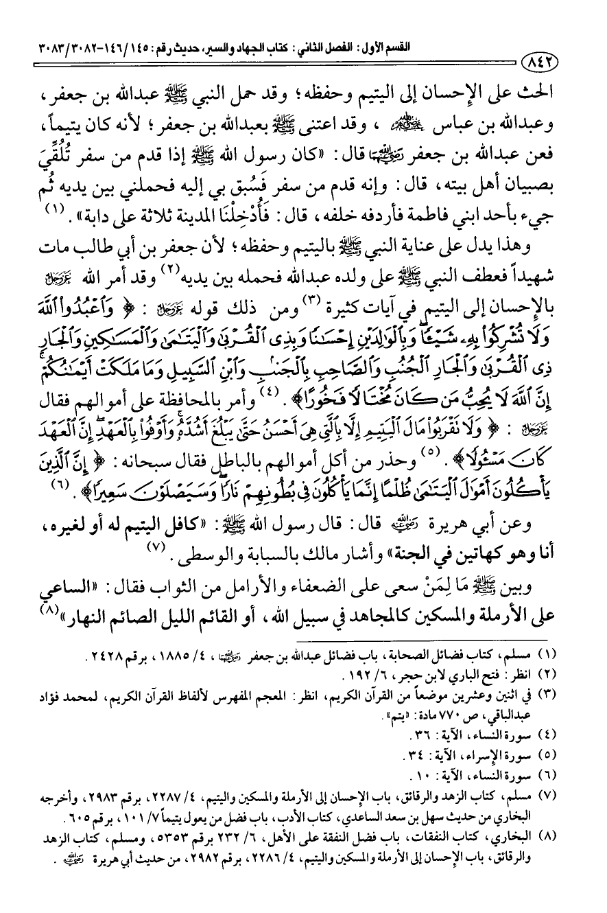 الحث على الإحسان إلى اليتيم وحفظه؛ وقد حمل النبي صلى الله عليه وسلم عبد الله بن جعفر، وعبد الله بن عباس رضي الله عنهم، وقد اعتنى صلى الله عليه وسلم بعبد الله بن جعفر؛ لأنه كان يتيما، فعن عبد الله بن جعفر رضي الله عنهما قال: «كان رسول الله صلى الله عليه وسلم إذا قدم من سفر تلقّي بصبيان أهل بيته، قال: إنه قدم من سفر فسبق بي إليه فحملني بين يديه ثم جيء بأحد ابني فاطمة فأردفه خلفه، قال: فأدخلنا المدينة ثلاثة على دابة» (¬1) وهذا يدل على عناية النبي صلى الله عليه وسلم باليتيم وحفظه؛ لأن جعفر بن أبي طالب مات شهيدا فعطف النبي صلى الله عليه وسلم على ولده عبد الله فحمله بين يديه (¬2) وقد أمر الله عزّ وجلّ بالإحسان إلى اليتيم في آيات كثيرة (¬3) ومن ذلك قوله عزّ وجلّ: {وَاعْبُدُوا اللَّهَ وَلَا تُشْرِكُوا بِهِ شَيْئًا وَبِالْوَالِدَيْنِ إِحْسَانًا وَبِذِي الْقُرْبَى وَالْيَتَامَى وَالْمَسَاكِينِ وَالْجَارِ ذِي الْقُرْبَى وَالْجَارِ الْجُنُبِ وَالصَّاحِبِ بِالْجَنْبِ وَابْنِ السَّبِيلِ وَمَا مَلَكَتْ أَيْمَانُكُمْ إِنَّ اللَّهَ لَا يُحِبُّ مَنْ كَانَ مُخْتَالًا فَخُورًا} [النساء: 36] (¬4) وأمر بالمحافظة على أموالهم فقال عزّ وجلّ: {وَلَا تَقْرَبُوا مَالَ الْيَتِيمِ إِلَّا بِالَّتِي هِيَ أَحْسَنُ حَتَّى يَبْلُغَ أَشُدَّهُ وَأَوْفُوا بِالْعَهْدِ إِنَّ الْعَهْدَ كَانَ مَسْئُولًا} [الإسراء: 34] (¬5) وحذر من أكل أموالهم بالباطل فقال سبحانه: {إِنَّ الَّذِينَ يَأْكُلُونَ أَمْوَالَ الْيَتَامَى ظُلْمًا إِنَّمَا يَأْكُلُونَ فِي بُطُونِهِمْ نَارًا وَسَيَصْلَوْنَ سَعِيرًا} [النساء: 10] (¬6) وعن أبي هريرة رضي الله عنه قال: قال رسول الله صلى الله عليه وسلم: «كافل اليتيم له أو لغيره، أنا وهو كهاتين في الجنة» وأشار مالك بالسبابة والوسطى (¬7).