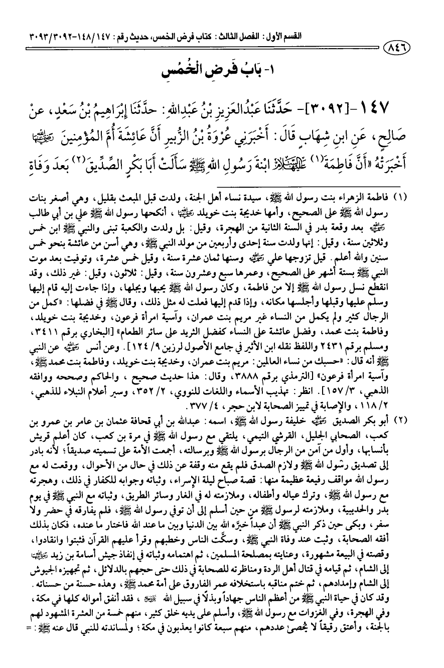 147 - [3092] حدّثنا عبد العزيز بن عبد الله: حدّثنا إبراهيم بن سعد، عن صالح، عن ابن شهاب قال: أخبرني عروة بن الزّبير أنّ عائشة أمّ المؤمنين رضي الله عنها أخبرته «أنّ فاطمة (¬1) عليها السلام ابنة رسول الله صلى الله عليه وسلم سألت أبا بكر الصّدّيق (¬2).