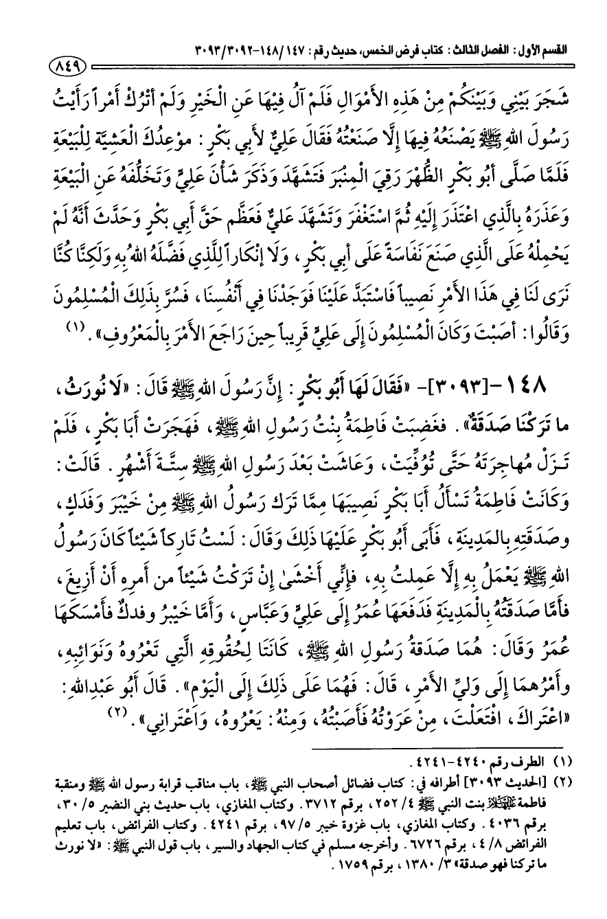 (¬2) [الحديث 3093، أطرافه في: كتاب فضائل أصحاب النبي صلى الله عليه وسلم، باب مناقب قرابة رسول الله صلى الله عليه وسلم ومنقبة فاطمة عليها السلام بنت النبي صلى الله عليه وسلم 4/ 252 برقم 3712. وكتاب المغازي، باب حديث بعث النضير 5/ 30، برقم 4036. وكتاب المغازي، باب غزوة خيبر 5/ 97 برقم 4241. وكتاب الفرائض، باب تعليم الفرائض 8/ 4، برقم 6726 وأخرجه مسلم في كتاب الجهاد والسير، باب قول النبي صلى الله عليه وسلم: "لا نورث ما تركنا فهو صدقة" 3/ 1380، برقم 1759.