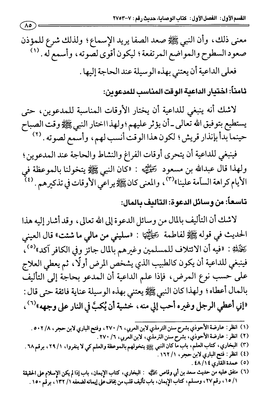 تاسعا: من وسائل الدعوة: التأليف بالمال: لا شك أن التأليف بالمال من وسائل الدعوة إلى الله تعالى، وقد أشار إليه هذا الحديث في قوله صلى الله عليه وسلم لفاطمة رضي الله عنها: " سليني من مالي ما شئت " قال العيني رحمه الله: " فيه أن الائتلاف للمسلمين وغيرهم بالمال جائز وفي الكافر آكد " (¬5) فينبغي للداعية أن يكون كالطبيب الذي يشخص المرض أولا، ثم يعطي العلاج على حسب نوع المرض، فإذا علم الداعية أن المدعو بحاجة إلى التأليف بالمال أعطاه؛ ولهذا كان النبي صلى الله عليه وسلم يعتني بهذه الوسيلة عناية فائقة حتى قال: «إني أعطي الرجل وغيره أحب إلي منه، خشية أن يكبَّ في النار على وجهه» (¬6)