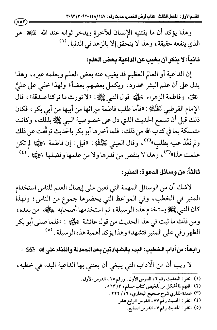 ثانيا: لا ينكر أن يغيب عن الداعية بعض العلم: إن الداعية أو العالم العظيم قد يغيب عنه بعض العلم ويعلمه غيره، وهذا يدل على أن علم البشر محدود، ويكمل بعضهم بعضا؛ ولهذا خفي على عليّ رضي الله عنه وفاطمة الزهراء رضي الله عنها قول النبي صلى الله عليه وسلم: «لا نورث ما تركنا صدقة"،» قال الإمام القرطبي رحمه الله: "فأما طلب فاطمة ميراثها من أبيها من أبي بكر، فكان ذلك قبل أن تسمع الحديث الذي دل على خصوصية النبي صلى الله عليه وسلم بذلك، وكانت متمسكة بما في كتاب الله من ذلك، فلما أخبرها أبو بكر بالحديث توقفت عن ذلك ولم تعد عليه بطلب" (¬2) وقال العيني رحمه الله: "قيل: إن فاطمة رضي الله عنه لم تكن علمت هذا" (¬3) وهذا لا ينقص من قدرها ولا من علمها وفضلها رضي الله عنها (¬4).