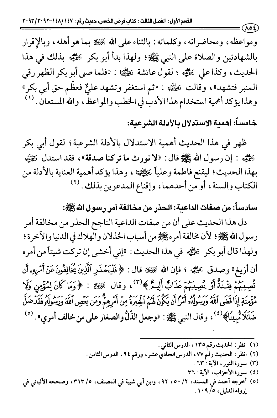 خامسا: أهمية الاستدلال بالأدلة الشرعية: ظهر في هذا الحديث أهمية الاستدلال بالأدلة الشرعية؛ لقول أبي بكر رضي الله عنه: إن رسول الله صلى الله عليه وسلم قال: «لا نورث ما تركنا صدقة»، فقد استدل رضي الله عنه بهذا الحديث؛ ليقنع فاطمة وعليا رضي الله عنهما، وهذا يؤكد أهمية العناية بالأدلة من الكتاب والسنة، أو من أحدهما، وإقناع المدعوين بذلك (¬2).