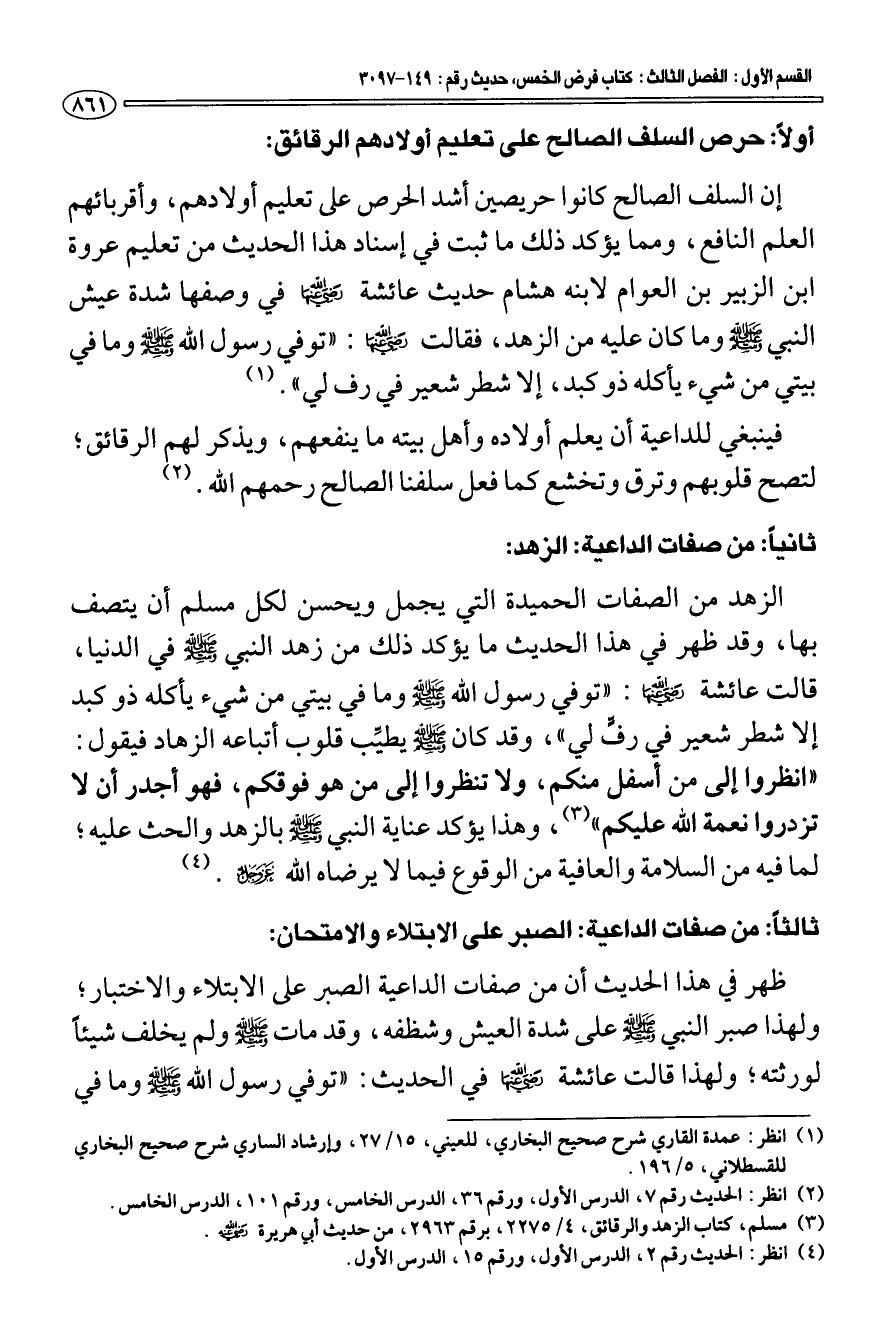 أولا: حرص السلف الصالح على تعليم أولادهم الرقائق: إن السلف الصالح كانوا حريصين أشد الحرص على تعليم أولادهم، وأقربائهم العلم النافع، ومما يؤكد ذلك ما ثبت في إسناد هذا الحديث من تعليم عروة بن الزبير بن العوام لابنه هشام حديث عائشة رضي الله عنها في وصفها شدة عيش النبي صلى الله عليه وسلم وما كان عليه من الزهد، فقالت رضي الله عنها: «توفي رسول الله صلى الله عليه وسلم وما في بيتي من شيء يأكله ذو كبد، إلا شطر شعير في رف لي".» (¬1).