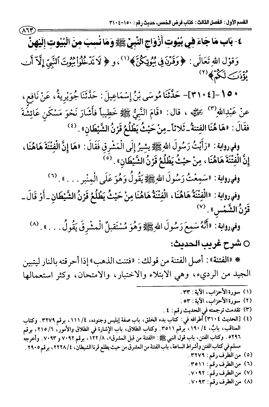 150 - [3104] حدّثنا موسى بن إسماعيل: حدّثنا جويرية، عن نافع، عن عبد الله (¬3) رضي الله عنه، قال: " قام النّبيّ صلى الله عليه وسلم خطيبا فأشار نحو مسكن عائشة فقال: «ها هنا الفتنة - ثلاثا - من حيث يطلع قرن الشّيطان» (¬4).