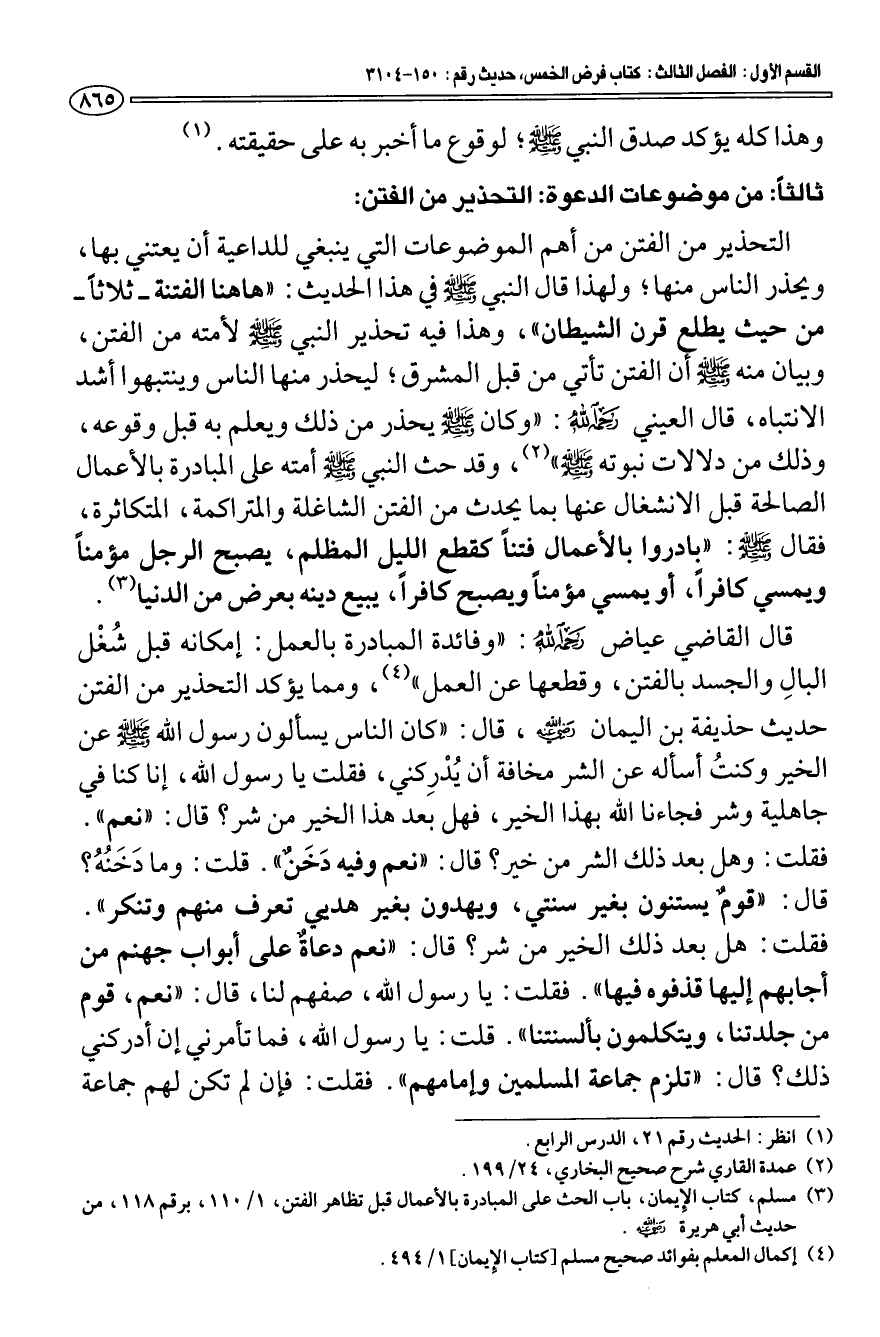 قال القاضي عياض رحمه الله: "وفائدة المبادرة بالعمل: إمكانه قبل شغل البال والجسد بالفتن، وقطعها عن العمل" (¬4) ومما يؤكد التحذير من الفتن حديث حذيفة بن اليمان رضي الله عنه، قال: «كان الناس يسألون رسول الله صلى الله عليه وسلم عن الخير وكنت أسأله عن الشر مخافة أن يدركني، فقلت يا رسول الله، إنا كنا في جاهلية وشر فجاءنا الله بهذا الخير، فهل بعد هذا الخير من شر؛ قال: "نعم". فقلت: وهل بعد ذلك الشر من خير؛ قال: "نعم وفيه دخن". قلت: وما دخنه؟ قال: "قوم يستنون بغير سنتي، ويهدون بغير هديي تعرف منهم وتنكر". فقلت: هل بعد ذلك الخير من شر؟ قال: "نعم دعاة على أبواب جهنم من أجابهم إليها قذفوه فيها. فقلت: يا رسول الله، صفهم لنا، قال: "نعم، قوم من جلدتنا، ويتكلمون بألسنتنا". قلت: يا رسول الله، فما تأمرني إن أدركني ذلك؛ قال: "تلزم جماعة المسلمين وإمامهم ". فقلت: فإن لم تكن لهم جماعة