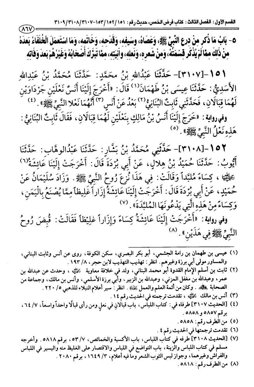 5 - باب ما ذكر من درع النبي صلى الله عليه وسلم، وعصاه، وسيفه، وقدحه، وخاتمه وما استعمل الخلفاء بعده من ذلك مما لم يذكر قسمته، ومن شعره، ونعله، وآنيته، ممّا تبرك أصحابه وغيرهم بعد وفاته.