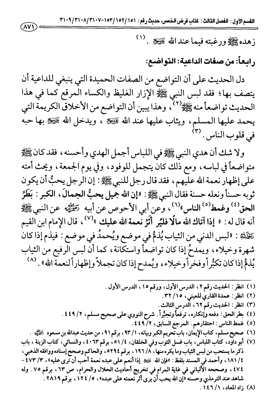 (¬7) أبو داود، كتاب اللباس، باب غسل الثوب وفي الخلقان، 4/ 51، برقم 4063، والنسائي، كتاب الزينة، باب ذكر ما يستحب من لبس الثياب وما يكره منها، 8/ 196، برقم 5294، والحاكم وصحح إسناده ووافقه الذهبي، 4/ 181، وأحمد في المسند بلفظ: "فإن الله عزّ وجلّ إذا أنعم على عبده نعمة أحب أن ترى عليه"، 3/ 473 - 474، وصححه الألباني في غاية المرام في تخريج أحاديث الحلال والحرام، ص 63، برقم 75. وله شاهد عند الترمذي وحسنه "إن الله يحب أن يرى أثر نعمته على عبده"، 5/ 124، برقم 2819.