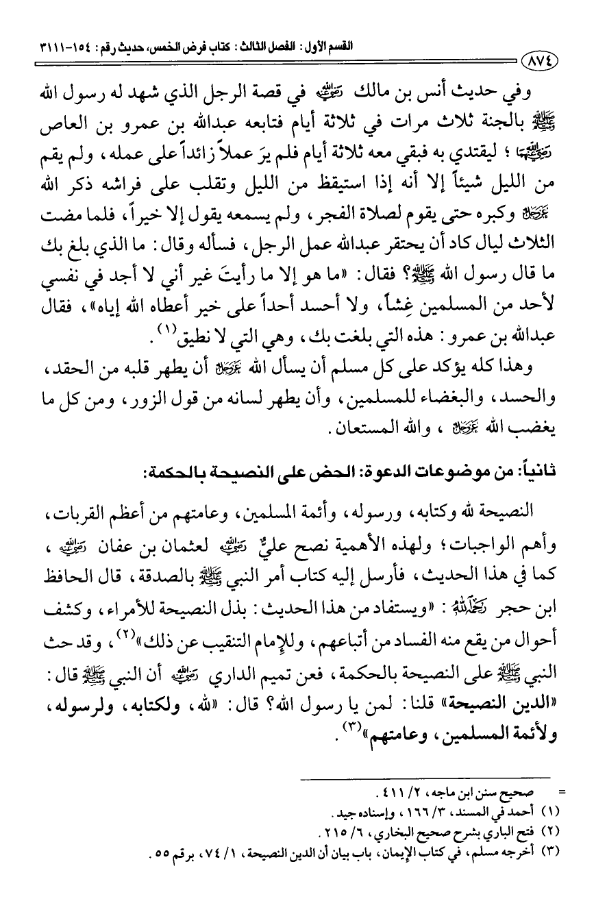 ثانيا: من موضوعات الدعوة: الحض على النصيحة بالحكمة: النصيحة لله وكتابه، ورسوله، وأئمة المسلمين، وعامتهم من أعظم القربات، وأهم الواجبات؛ ولهذه الأهمية نصح عليّ رضي الله عنه لعثمان بن عفان رضي الله عنه، كما في هذا الحديث، فأرسل إليه كتاب أمر النبي صلى الله عليه وسلم بالصدقة، قال الحافظ ابن حجر رحمه الله: "ويستفاد من هذا الحديث: بذل النصيحة للأمراء، وكشف أحوال من يقع منه الفساد من أتباعهم، وللإمام التنقيب عن ذلك" (¬2) وقد حث النبي صلى الله عليه وسلم على النصيحة بالحكمة، فعن تميم الداري رضي الله عنه أن النبي صلى الله عليه وسلم قال: «الدين النصيحة" قلنا: لمن يا رسول الله؛ قال: "لله، ولكتابه، ولرسوله، ولأئمة المسلمين، وعامتهم» (¬3).