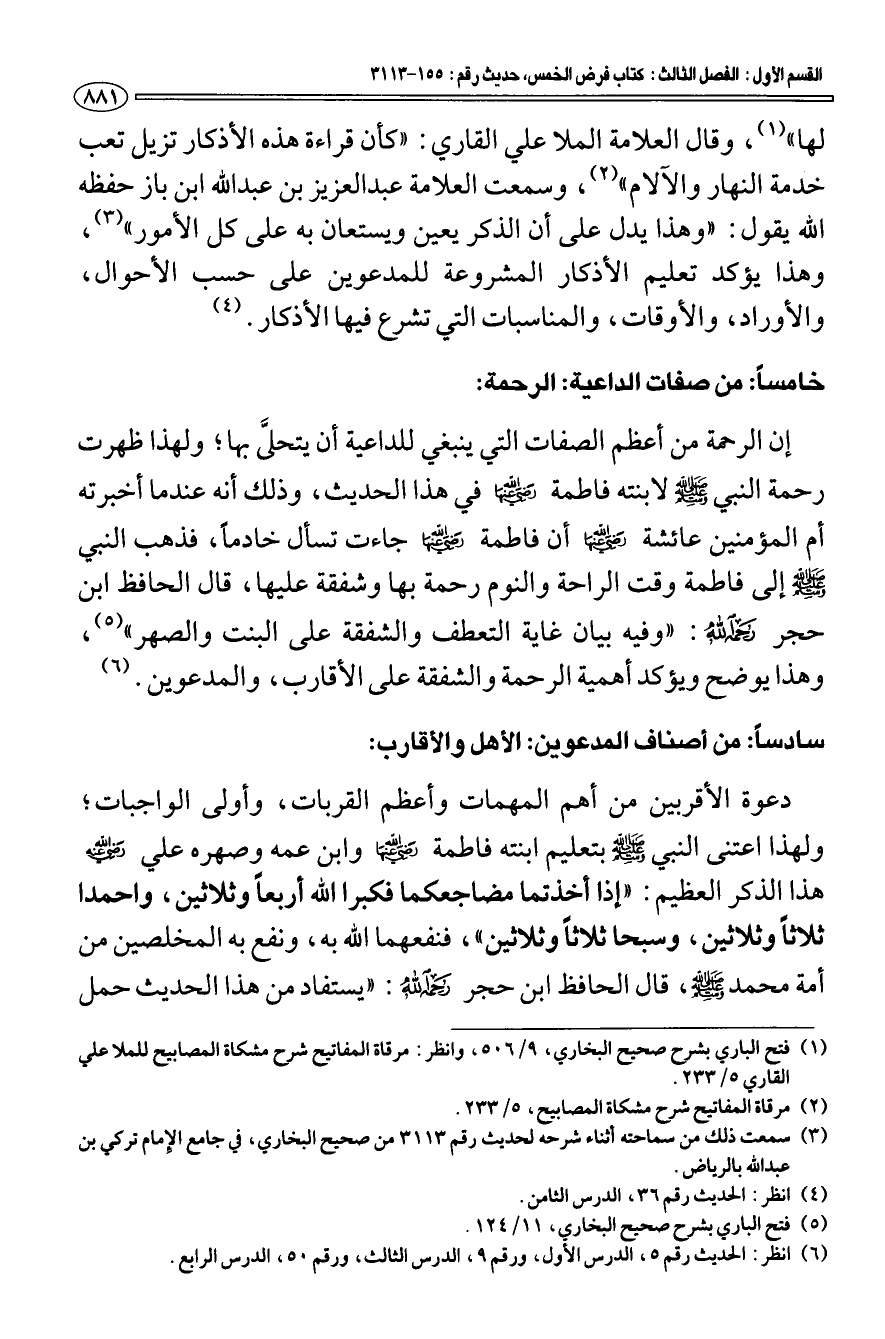 خامسا: من صفات الداعية: الرحمة: إن الرحمة من أعظم الصفات التي ينبغي للداعية أن يتحلىّ بها؛ ولهذا ظهرت رحمة النبي صلى الله عليه وسلم لابنته فاطمة رضي الله عنها في هذا الحديث، وذلك أنه عندما أخبرته أم المؤمنين عائشة رضي الله عنها أن فاطمة رضي الله عنها جاءت تسأل خادما، فذهب النبي إلى فاطمة وقت الراحة والنوم رحمة بها وشفقة عليها، قال الحافظ ابن حجر رحمه الله: "وفيه بيان غاية التعطف والشفقة على البنت والصهر" (¬5) وهذا يوضح ويؤكد أهمية الرحمة والشفقة على الأقارب، والمدعوين. (¬6).