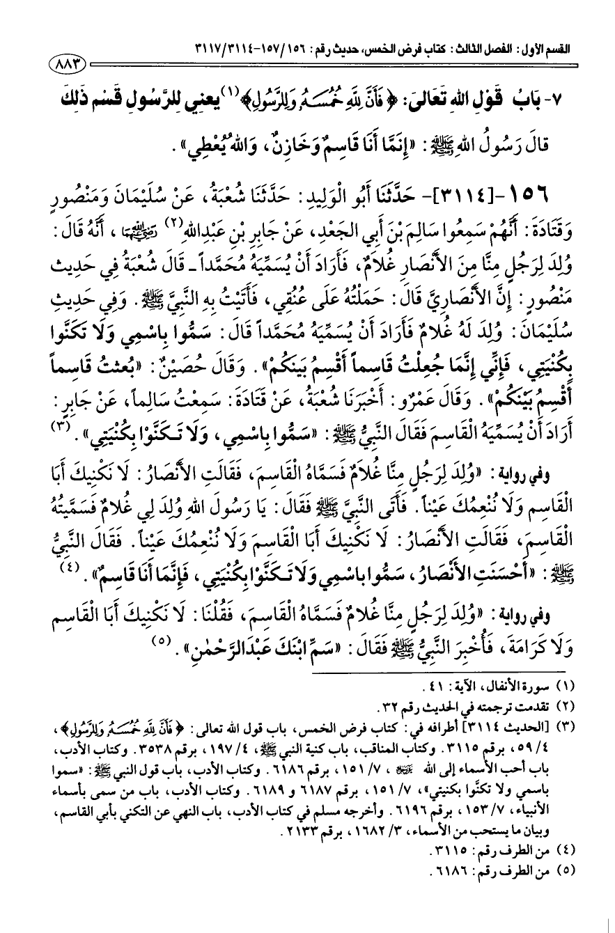 (¬3) [الحديث 3114] أطرافه في: كتاب فرض الخمس، باب قول الله تعالى: فَأَنَّ لِلَّهِ خُمُسَهُ وَلِلرَّسُولِ 4/ 59، برقم 3115. وكتاب المناقب، باب كنية النبي صلى الله عليه وسلم، 4/ 197، برقم 3538. وكتاب الأدب، باب أحب الأسماء إلى الله عزّ وجلّ، 7/ 151، برقم 6186. وكتاب الأدب، باب كنية النبي صلى الله عليه وسلم: "سموا باسمي ولا تكنوا بكنيتي"، 7/ 151، برقم 6187 و6189. وكتاب الأدب، باب من سمى بأسماء الأنبياء، 7/ 153، برقم 6196. وأخرجه مسلم في كتاب الأدب، باب النهي عن التكني بأبي القاسم، وبيان ما يستحب من الأسماء، 3/ 1682، برقم 2133.
