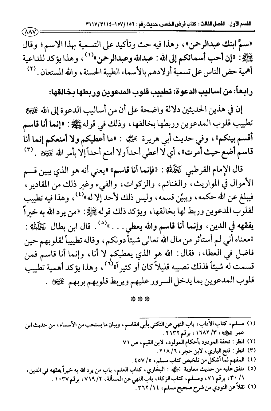 رابعا: من أساليب الدعوة: تطييب قلوب المدعوين وربطها بخالقها: إن في هذين الحديثين دلالة واضحة على أن من أساليب الدعوة إلى الله عزّ وجلّ تطييب قلوب المدعوين وربطها بخالقها، وذلك في قوله صلى الله عليه وسلم: «إنما أنا قاسم أقسم بينكم»، وفي حديث أبي هريرة رضي الله عنه: «ما أعطيكم ولا أمنعكم إنما أنا قاسم أضع حيث أمرت»، أي لا أعطي أحدا ولا أمنع أحدا إلا بأمر الله عزّ وجلّ (¬3).
