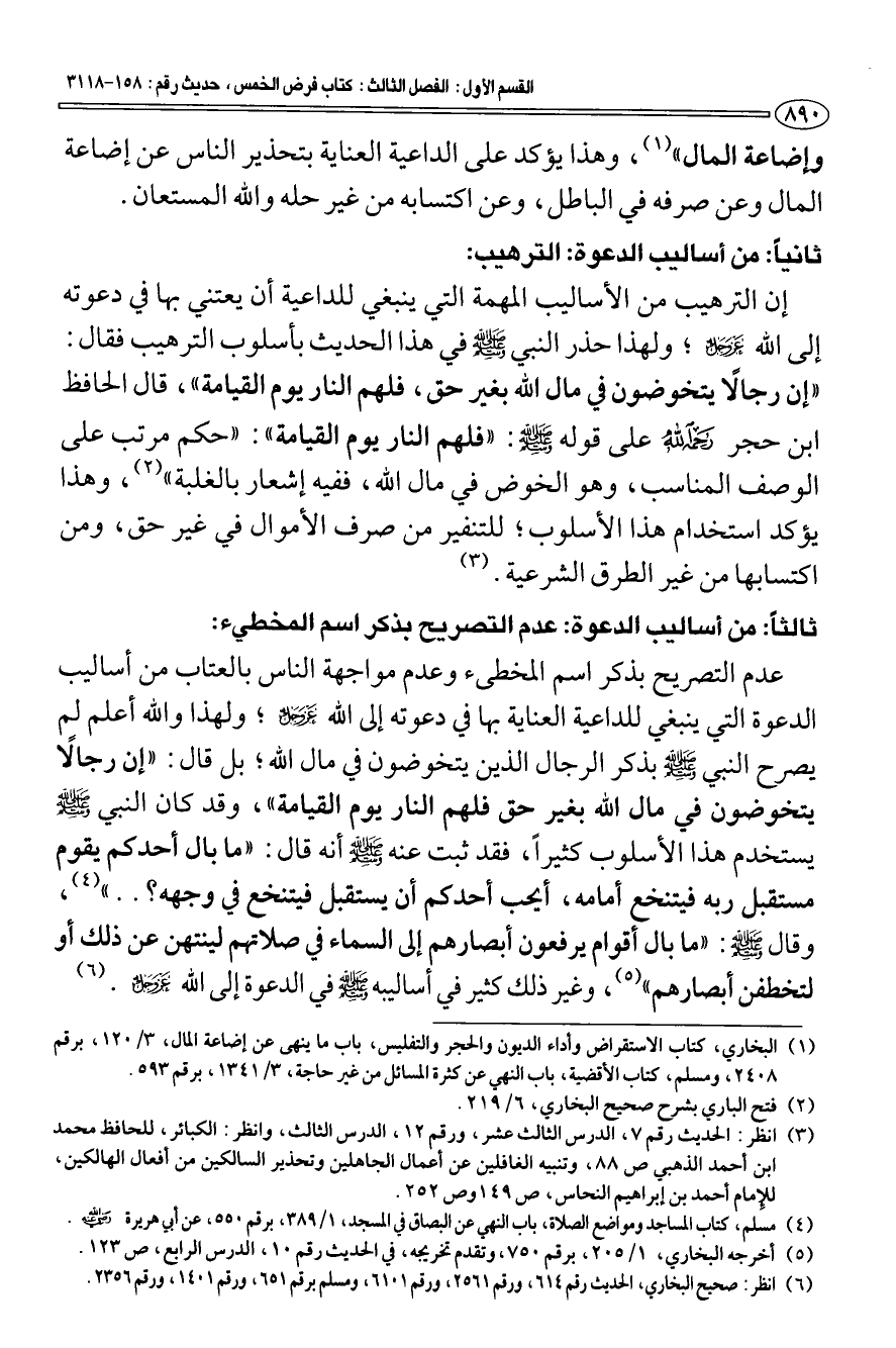 ثانيا: من أساليب الدعوة: الترهيب: إن الترهيب من الأساليب المهمة التي ينبغي للداعية أن يعتني بها في دعوته إلى الله عزّ وجلّ؛ ولهذا حذر النبي صلى الله عليه وسلم في هذا الحديث بأسلوب الترهيب فقال: «إن رجالا يتخوضون في مال الله بغير حق، لهم النار يوم القيامة»، قال الحافظ ابن حجر رحمه الله على قوله صلى الله عليه وسلم: «فلهم النار يوم القيامة»: "حكم مرتب على الوصف المناسب، وهو الخوض في مال الله، ففيه إشعار بالغلبة" (¬2).