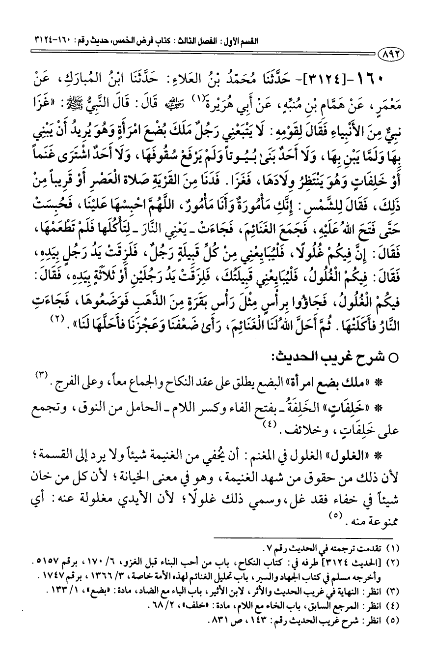 رضي الله عنه قال: قال النّبيّ صلى الله عليه وسلم: «غزا نبي من الأنبياء فقال لقومه: لا يتبعني رجل ملك بضع امرأة وهو يريد أن يبني بها ولمّا يبن بها، ولا أحد بنى بيوتا ولم يرفع سقوفها، ولا أحد اشترى غنما أو خلفات وهو ينتظر ولادها، فغزا. فدنا من القرية صلاة العصر أو قريبا من ذلك، فقال للشّمس: إنّك مأمورة وأنا مأمور، اللهمّ احبسها علينا، فحبست حتّى فتح الله عليه، فجمع الغنائم، فجاءت - يعني النّار - لتأكلها فلم تطعمها، فقال: إنّ فيكم غلولا، فليبايعني من كلّ قبيلة رجل، فلزقت يد رجل بيده، فقال: فيكم الغلول، فليبايعني قبيلتك، فلزقت يد رجلين أو ثلاثة بيده، فقال: فيكم الغلول، فجاءوا برأس مثل رأس بقرة من الذّهب فوضعوها، فجاءت النّار فأكلتها. ثمّ أحلّ الله لنا الغنائم، رأى ضعفنا وعجزنا فأحلّها لنا». [(¬2).