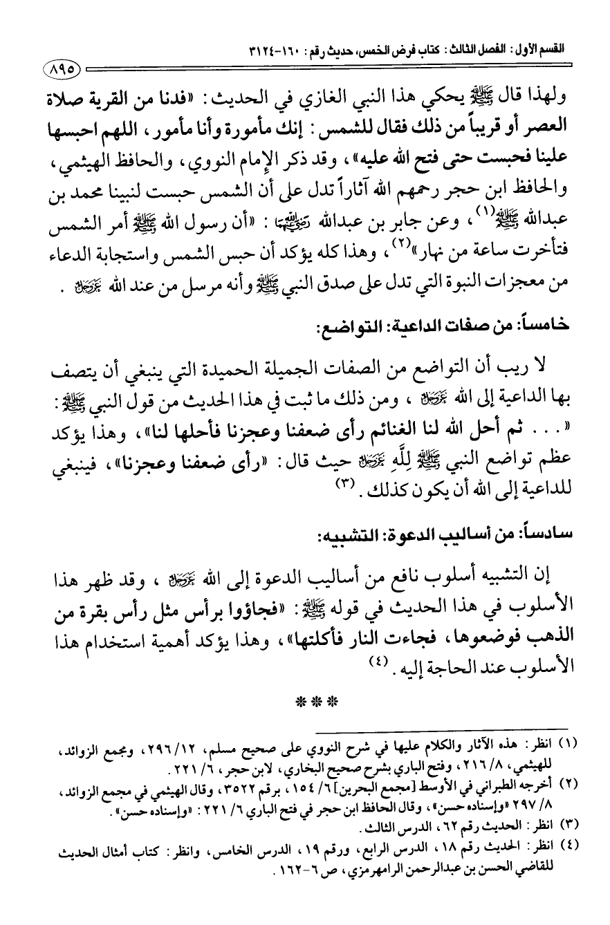 ولهذا قال صلى الله عليه وسلم يحكي هذا النبي الغازي في الحديث: «فدنا من القرية صلاة العصر أو قريبا من ذلك فقال للشمس: إنك مأمورة وأنا مأمور، اللهم احبسها علينا فحبست حتى فتح الله عليه»، وقد ذكر الإمام النووي، والحافظ الهيثمي، والحافظ ابن حجر رحمهم الله آثارا تدل على أن الشمس حبست لنبينا محمد بن عبد الله صلى الله عليه وسلم (¬1).