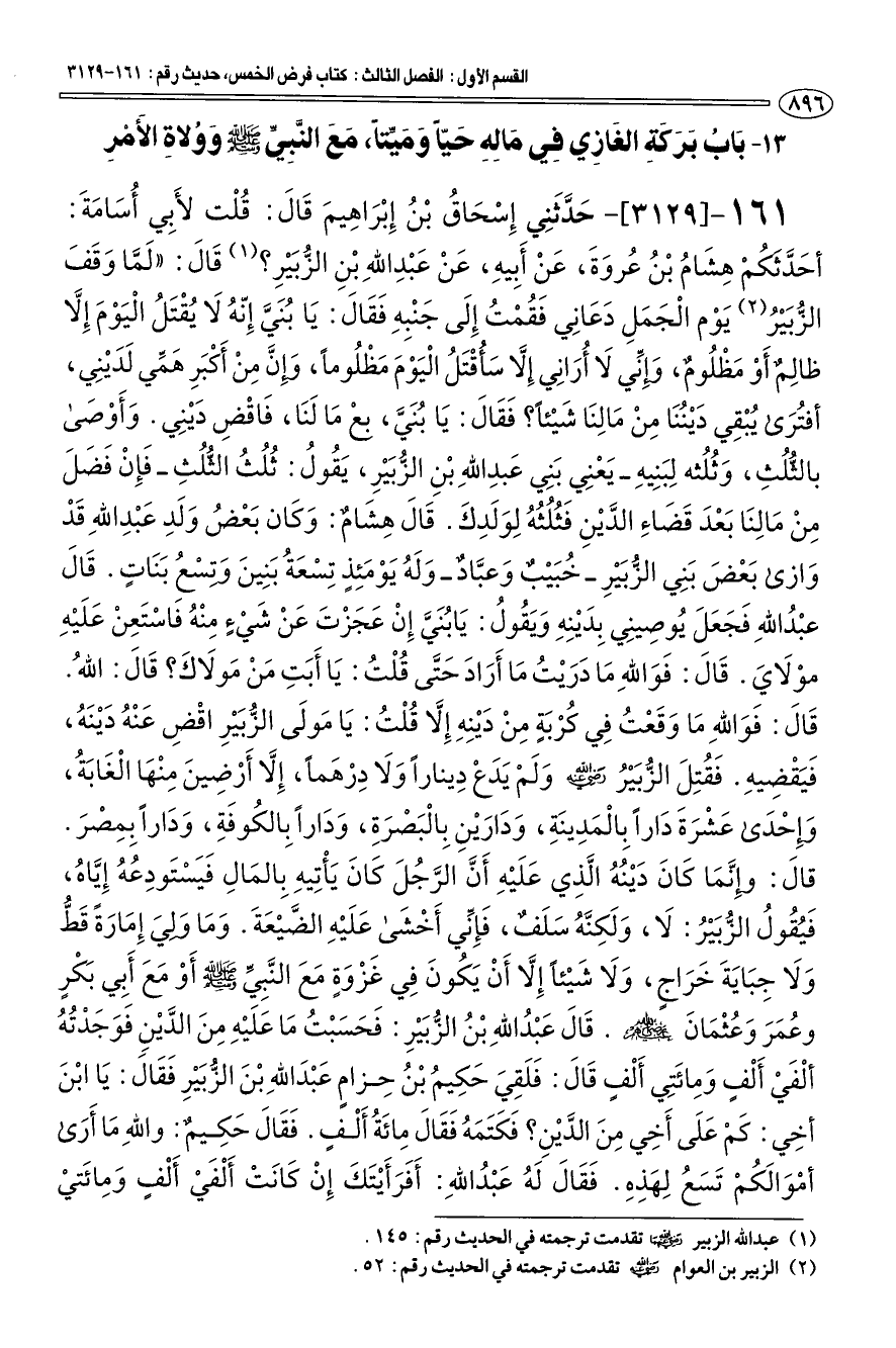 161 - [3129] حدّثني إسحاق بن إبراهيم قال: قلت لأبي أسامة: أحدّثكم هشام بن عروة، عن أبيه، عن عبد الله بن الزّبير؟ (¬1) قال: "لمّا وقف الزّبير (¬2) يوم الجمل دعاني فقمت إلى جنبه فقال: يا بنيّ إنّه لا يقتل اليوم إلّا ظالم أو مظلوم، وإنّي لا أراني إلّا سأقتل اليوم مظلوما، وإنّ من أكبر همّي لديني، أفترى يبقي ديننا من مالنا شيئا؟ فقال: يا بنيّ، بع ما لنا، فاقض ديني. وأوصى بالثلث، وثلثه لبنيه - يعني بني عبد الله بن الزّبير، يقول: ثلث الثلث - فإن فضل من مالنا بعد قضاء الدّين فثلثه لولدك. قال هشام: وكان بعض ولد عبد الله قد وازى بعض بني الزّبير - خبيب وعبّاد - وله يومئذ تسعة بنين وبنات. قال عبد الله فجعل يوصيني بدينه ويقول: يا بنيّ إن عجزت عن شيء منه فاستعن عليه مولاي. قال: فوالله ما دريت ما أراد حتّى قلت: يا أبت من مولاك؟ قال: الله. قال: فوالله ما وقعت في كربة من دينه إلّا قلت: يا مولى الزّبير اقض عنه دينه، فيقضيه. فقتل الزّبير رضي الله عنه ولم يدع دينارا ولا درهما، إلّا أرضين منها الغابة، وإحدى عشرة دارا بالمدينة، ودارين بالبصرة، ودارا بالكوفة، ودارا بمصر. قال: وإنّما كان دينه الّذي عليه أنّ الرّجل كان يأتيه بالمال فيستودعه إيّاه، فيقول الزّبير: لا، ولكنّه سلف، فإنّي أخشى عليه الضّيعة. وما ولي إمارة قطّ ولا جباية خراج، ولا شيئا إلّا أن يكون في غزوة مع النّبيّ صلى الله عليه وسلم أو مع أبي بكر وعمر وعثمان رضي الله عنهم قال عبد الله بن الزّبير: فحسبت ما عليه من الدّين فوجدتة ألفي ألف ومائتي ألف قال: فلقي حكيم بن حزام عبد الله بن الزّبير فقال: يا ابن أخي: كم على أخي من الدّين؛ فكتمه فقال مائة ألف. فقال حكيم: والله ما أرى أموالكم تسع لهذه. فقال له عبد الله: أفرأيتك إن كانت ألفي ألف ومائتي