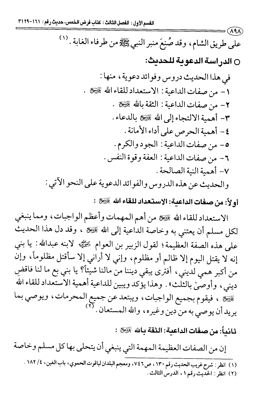 أولا: من صفات الداعية: الاستعداد للقاء الله عزّ وجلّ: الاستعداد للقاء الله عزّ وجلّ من أهم المهمات وأعظم الواجبات، ومما ينبغي لكل مسلم أن يعتني به وخاصة الداعية إلى الله عزّ وجلّ، وقد دل هذا الحديث على هذه الصفة العظيمة؛ لقول الزبير بن العوام رضي الله عنه لابنه عبد الله: يا بني إنه لا يقتل اليوم إلا ظالم أو مظلوم، وإني لا أراني إلا سأقتل مظلوما، وإن من أكبر همي لديني، أفترى يبقي ديننا من مالنا شيئا؟ يا بني بع ما لنا فاقض ديني، وأوصى بالثلث". وهذا يؤكد ويبين للداعية أهمية الاستعداد للقاء الله عزّ وجلّ، فيقوم بجميع الواجبات، ويبتعد عن جميع المحرمات، ويوصي بما يريد أن يوصي به من دين وغيره، والله المستعان (¬2).