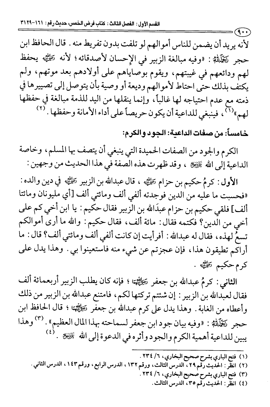 الثاني: كرم عبد الله بن جعفر رضي الله عنه؛ فإنه كان يطلب الزبير أربعمائة ألف فقال لعبد الله بن الزبير: إن شئتم تركتها لكم، فامتنع عبد الله بن الزبير من ذلك وأعطاه من الغابة. وهذا يدل على كرم عبد الله بن جعفر رضي الله عنه؛ قال الحافظ ابن حجر رحمه الله: "وفيه بيان جود ابن جعفر لسماحته بهذا المال العظيم" (¬3) وهذا يبين للداعية أهمية الكرم والجود وأثره في الدعوة إلى الله عزّ وجلّ (¬4).