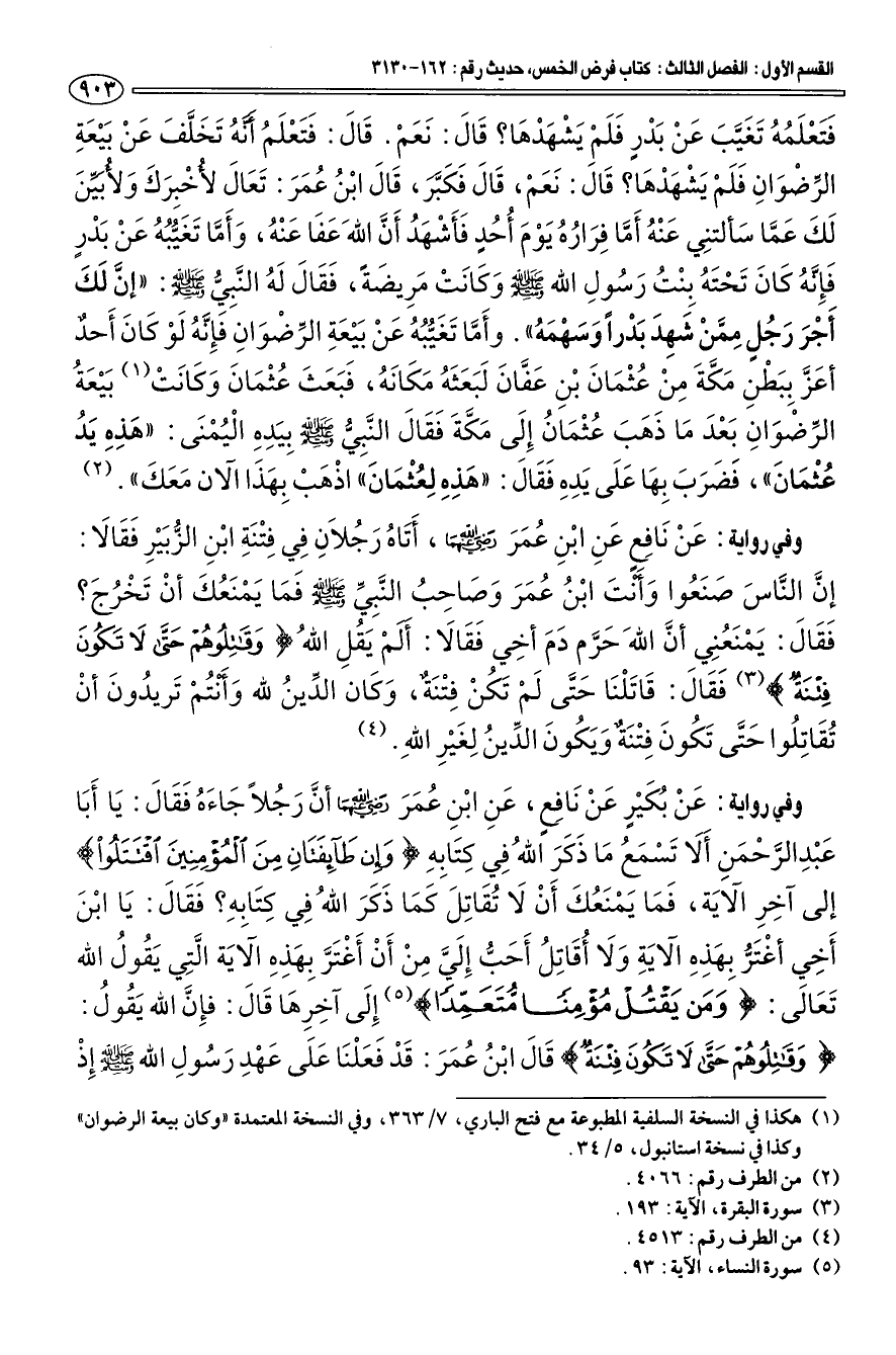 فتعلمه تغيّب عن بدر فلم يشهدها؟ قال: نعم. قال: فتعلم أنه تخلّف عن بيعة الرضوان فلم يشهدها؟ قال: نعم، قال فكبّر، قال ابن عمر: تعال لأخبرك ولأبيّن لك عمّا سألتني عنه أمّا فراره يوم أحد فأشهد أنّ الله عفا عنه، وأمّا تغيّبه عن بدر فإنه كان تحته بنت رَسُولِ الله صلى الله عليه وسلم وكانت مريضة، فقال له النّبيّ صلى الله عليه وسلم: «إنّ لك أجر رجل ممّن شهد بدرا وسهمه». وأمّا تغيّبه عن بيعة الرّضوان فإنّه لو كان أحد أعز ببطن مكّة من عثمان بن عفّان لبعثه مكانه، فبعث عثمان وكانت (¬1) بيعة الرّضوان بعد ما ذهب عثمان إلى مكّة فقال النّبيّ صلى الله عليه وسلم بيده اليمنى: «هذه يد عثمان»، فضرب بها على يده فقال: "هذه لعثمان " اذهب بهذا الآن معك" (¬2).