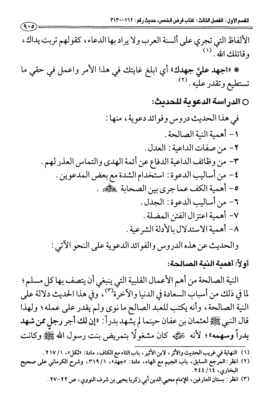 أولا: أهمية النية الصالحة: النية الصالحة من أهم الأعمال القلبية التي ينبغي أن يتصف بها كل مسلم؛ لما في ذلك من أسباب السعادة في الدنيا والآخرة (¬3) وفي هذا الحديث دلالة على النية الصالحة، وأنه يكتب للعبد الصالح ما نوى ولم يقدر على عمله؛ ولهذا قال النبي صلى الله عليه وسلم لعثمان بن عفان حينما لم يشهد بدرا: «إن لك أجر رجل ممن شهد بدرا وسهمه»؛ لأنه رضي الله عنه كان مشغولا بتمريض بنت رسول الله صلى الله عليه وسلم وكانت