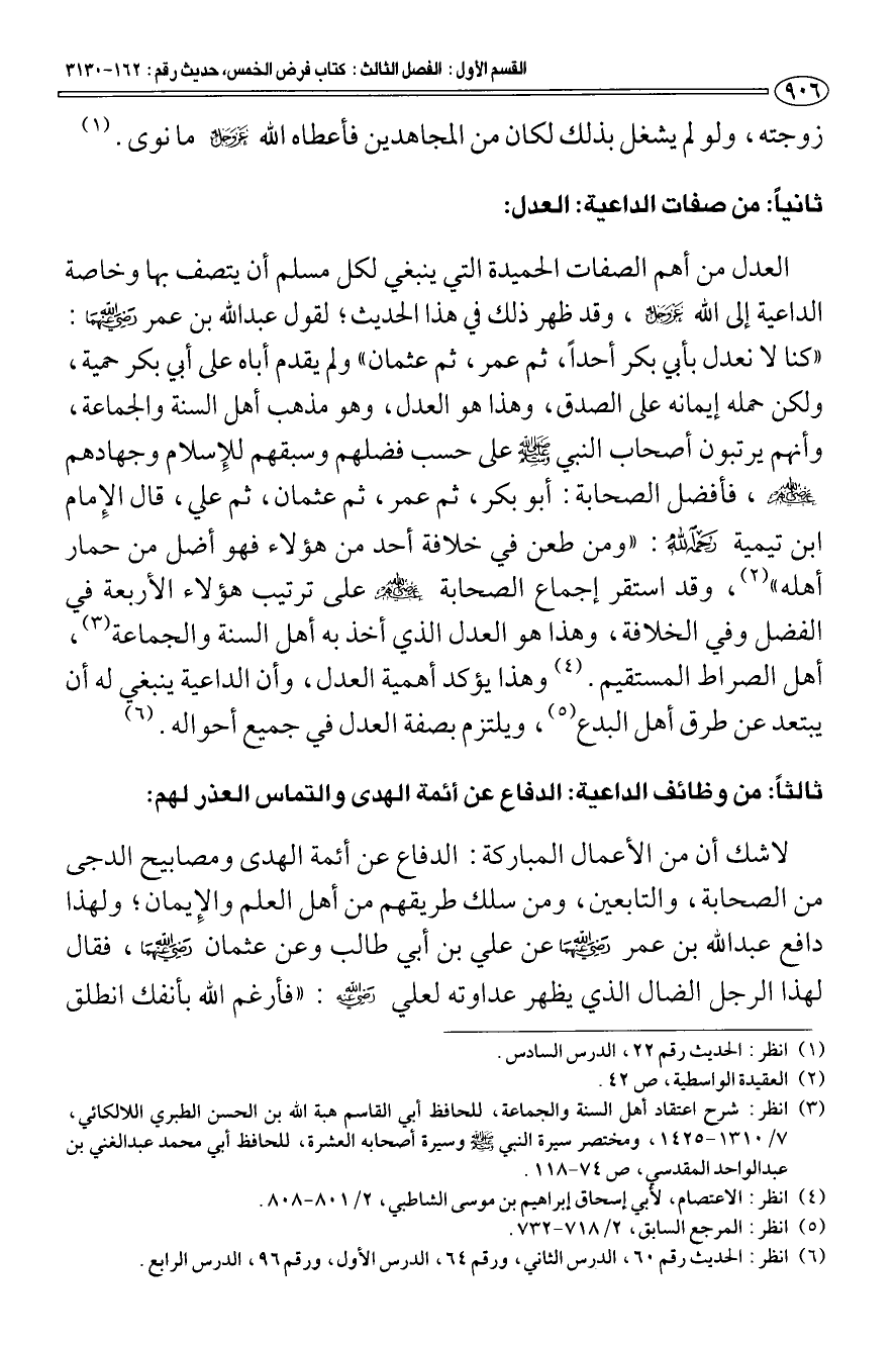 ثانيا: من صفات الداعية: العدل: العدل من أهم الصفات الحميدة التي ينبغي لكل مسلم أن يتصف بها وخاصة الداعية إلى الله عزّ وجلّ، وقد ظهر ذلك في هذا الحديث؛ لقول عبد الله بن عمر رضي الله عنه: "كنا لا نعدل بأبي بكر أحدا، ثم عمر، ثم عثمان " ولم يقدم أباه على أبي بكر حمية، ولكن حمله إيمانه على الصدق، وهذا هو العدل، وهو مذهب أهل السنة والجماعة، وأنهم يرتبون أصحاب النبي صلى الله عليه وسلم على حسب فضلهم وسبقهم للإسلام وجهادهم رضي الله عنهم، فأفضل الصحابة: أبو بكر، ثم عمر، ثم عثمان، ثم علي، قال الإمام ابن تيمية رحمه الله: "ومن طعن في خلافة أحد من هؤلاء فهو أضل من حمار أهله" (¬2) وقد استقر إجماع الصحابة رضي الله عنهم على ترتيب هؤلاء الأربعة في الفضل وفي الخلافة، وهذا هو العدل الذي أخذ به أهل السنة والجماعة (¬3) أهل الصراط المستقيم (¬4) وهذا يؤكد أهمية العدل، وأن الداعية ينبغي له أن يبتعد عن طرق أهل البدع (¬5) ويلتزم بصفة العدل في جميع أحواله (¬6).