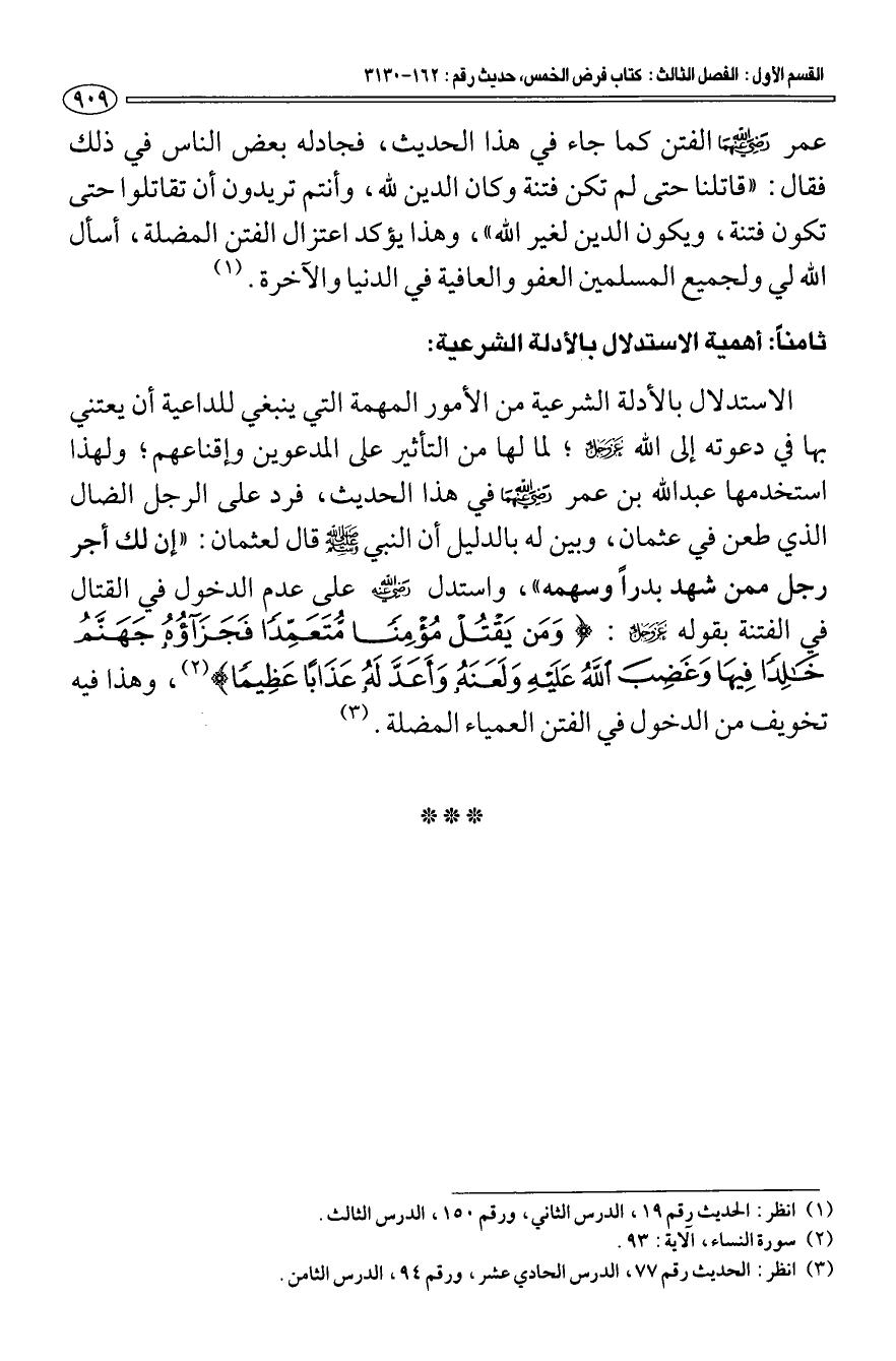ثامنا: أهمية الاستدلال بالأدلة الشرعية: الاستدلال بالأدلة الشرعية من الأمور المهمة التي ينبغي للداعية أن يعتني بها في دعوته إلى الله عزّ وجلّ؛ لما لها من التأثير على المدعوين وإقناعهم؛ ولهذا استخدمها عبد الله بن عمر رضي الله عنهما في هذا الحديث، فرد على الرجل الضال الذي طعن في عثمان، وبين له بالدليل أن النبي صلى الله عليه وسلم قال لعثمان: «إن لك أجر رجل ممن شهد بدرا وسهمه»، واستدل رضي الله عنه على عدم الدخول في القتال في الفتنة بقوله عزّ وجلّ: {وَمَنْ يَقْتُلْ مُؤْمِنًا مُتَعَمِّدًا فَجَزَاؤُهُ جَهَنَّمُ خَالِدًا فِيهَا وَغَضِبَ اللَّهُ عَلَيْهِ وَلَعَنَهُ وَأَعَدَّ لَهُ عَذَابًا عَظِيمًا} [النساء: 93] (¬2) وهذا فيه تخويف من الدخول في الفتن العمياء المضلة (¬3).