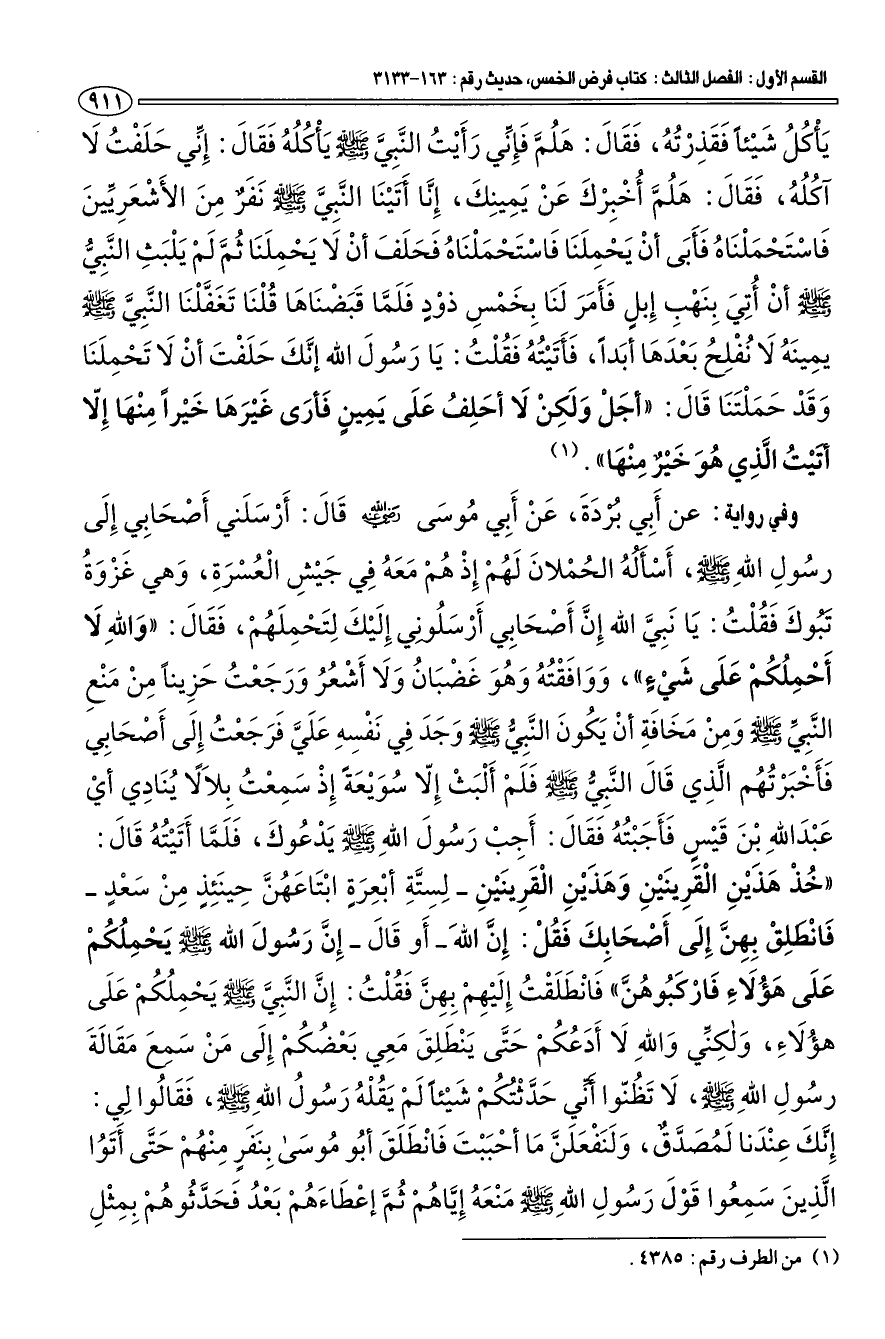 يأكل شيئا فقذرته، فقال: هلمّ فإنّي رأيت النّبيّ صلى الله عليه وسلم يأكله" فقال: إنّي حلفت لا آكل!، فقال: هلمّ أخبرك عن يمينك، إنّا أتينا النّبيّ صلى الله عليه وسلم نفر من الأشعريّين فاستحملناه فأبى أن يحملنا فاستحملناه فحلف أن لا يحملنا ثمّ لم يلبث النّبيّ صلى الله عليه وسلم أن أتي بنهب إبل فأمر لنا بخمس ذود فلمّا قبضناهما قلنا تغفّلنا النّبي صلى الله عليه وسلم يمينه لا نفلح بعدها أبدا، فأتيته فقلت: يا رسول الله إنك حلفت أن لا تحملنا وقد حملتنا قال: «أجل ولكن لا أحلف على يمين فأرى غيرها خيرا منها إلّا أتيت الّذي هو خير منها». (¬1).