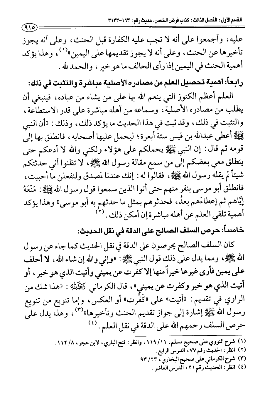 خامسا: حرص السلف الصالح على الدقة في نقل الحديث: كان السلف الصالح يحرصون على الدقة في نقل الحديث كما جاء عن رسول الله صلى الله عليه وسلم، ومما يدل على ذلك قول النبي صلى الله عليه وسلم: «وإني والله إن شاء الله، لا أحلف على يمين فأرى غيرها خيرا منها إلا كفرت عن يميني وأتيت الذي هو خير، أو أتيت الذي هو خير وكفرت عن يميني»، قال الكرماني رحمه الله: "هذا شك من الراوي في تقديم: "أتيت" على "كفّرت" أو العكس، وإما تنويع من تنويع رسول الله صلى الله عليه وسلم إشارة إلى جواز تقديم الحنث وتأخيرها" (¬3) وهذا يدل على حرص السلف رحمهم الله على الدقة في نقل العلم (¬4).