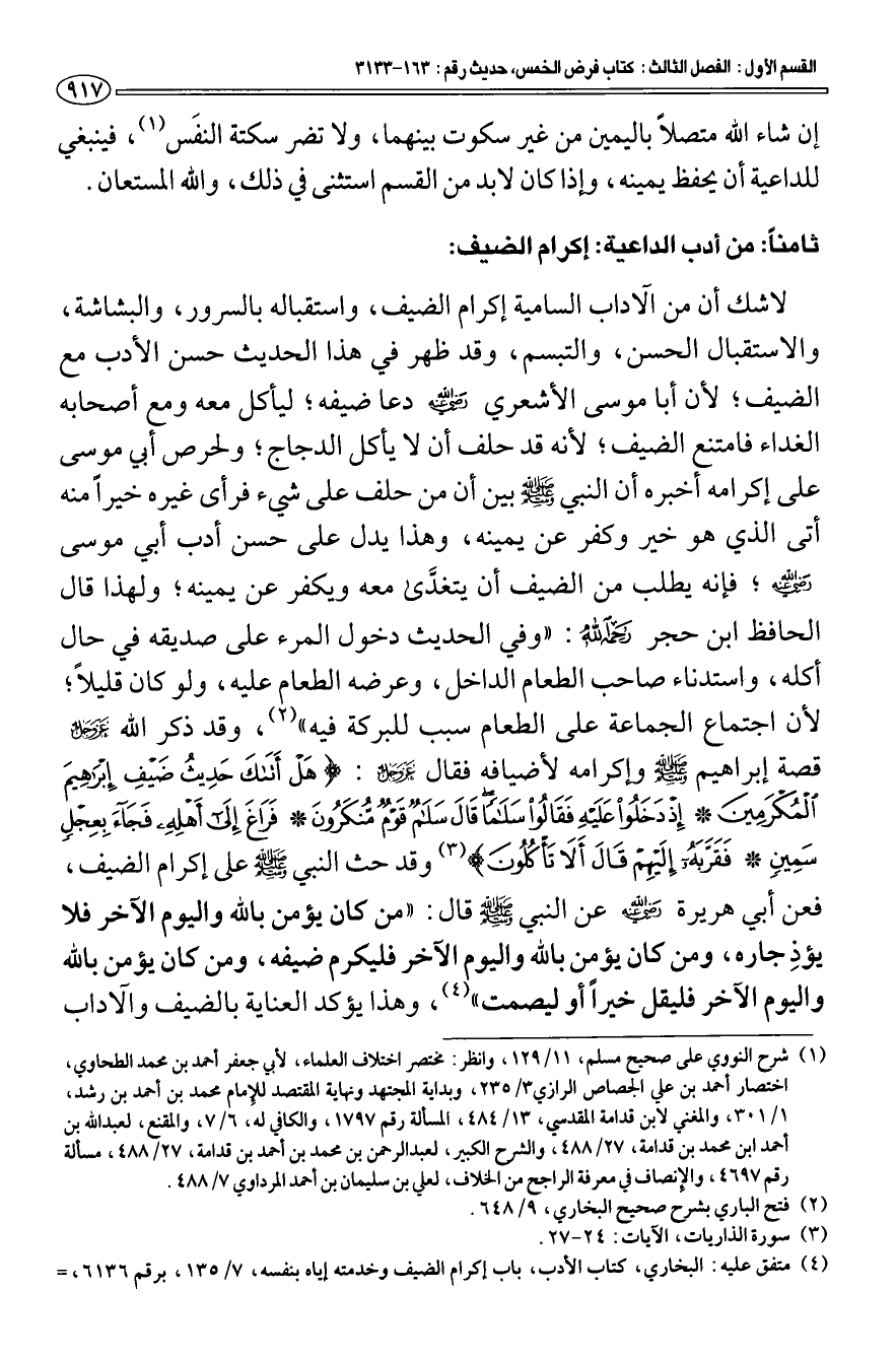 (¬4) متفق علبه: البخاري، كتاب الأدب، باب إكرام الضيف وخدمته إياه بنفسه، 7/ 135، برقم 6136، ومسلم كتاب الإيمان، باب الحث على إكرام الضيف والجار ولزوم الصمت إلا عن الخير، 1/ 68، برقم 47.