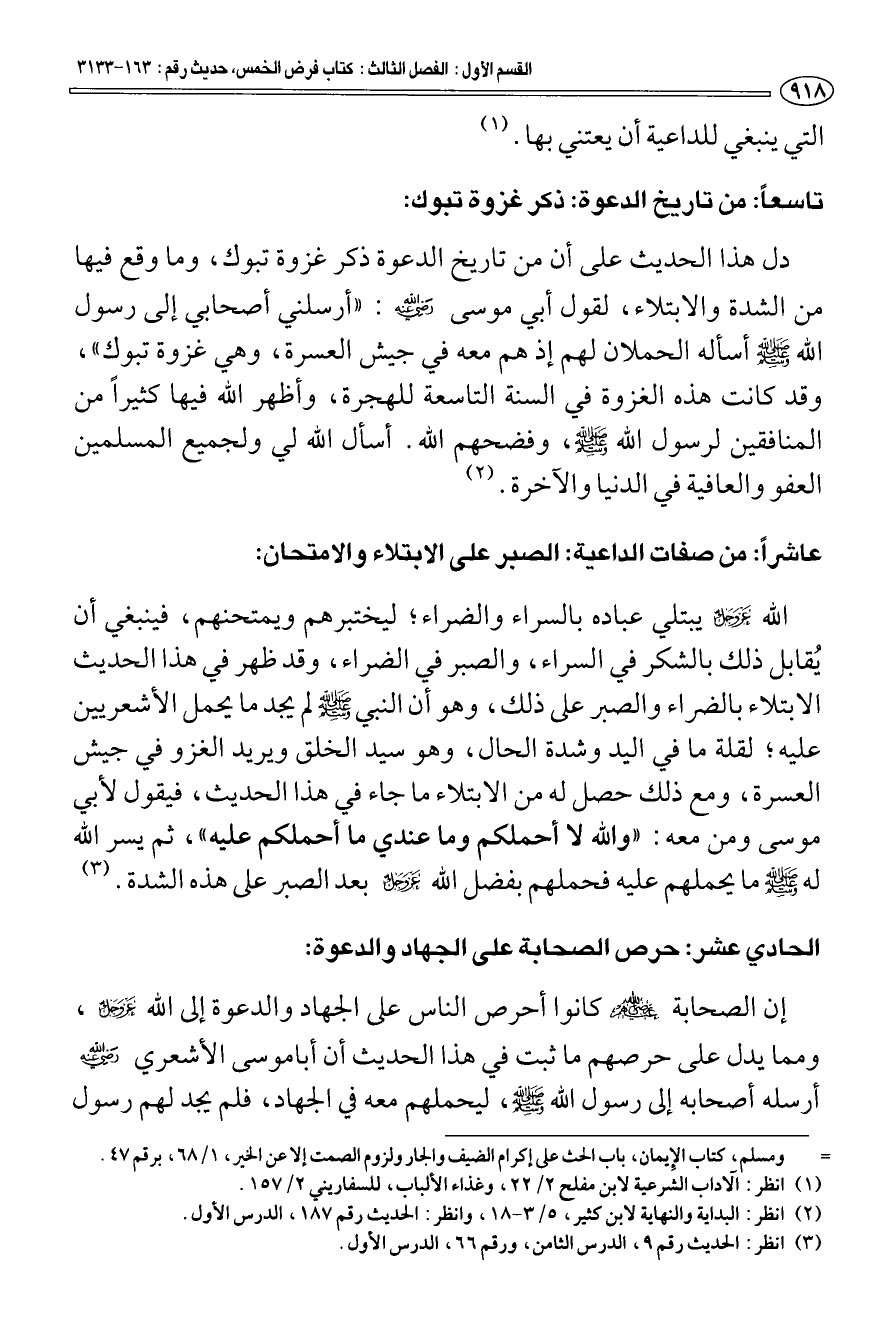 تاسعا: من تاريخ الدعوة: ذكر غزوة تبوك: دل هذا الحديث على أن من تاريخ الدعوة ذكر غزوة تبوك، وما وقع فيها من الشدة والابتلاء، لقول أبي موسى رضي الله عنه: "أرسلني أصحابي إلى رسول الله صلى الله عليه وسلم أسأله الحملان لهم إذ هم معه في جيش العسرة، وهي غزوة تبوك"، وقد كانت هذه الغزوة في السنة التاسعة للهجرة، وأظهر الله فيها كثيرا من المنافقين لرسول الله صلى الله عليه وسلم، وفضحهم الله. أسأل الله لي ولجميع المسلمين العفو والعافية في الدنيا والآخرة (¬2).
