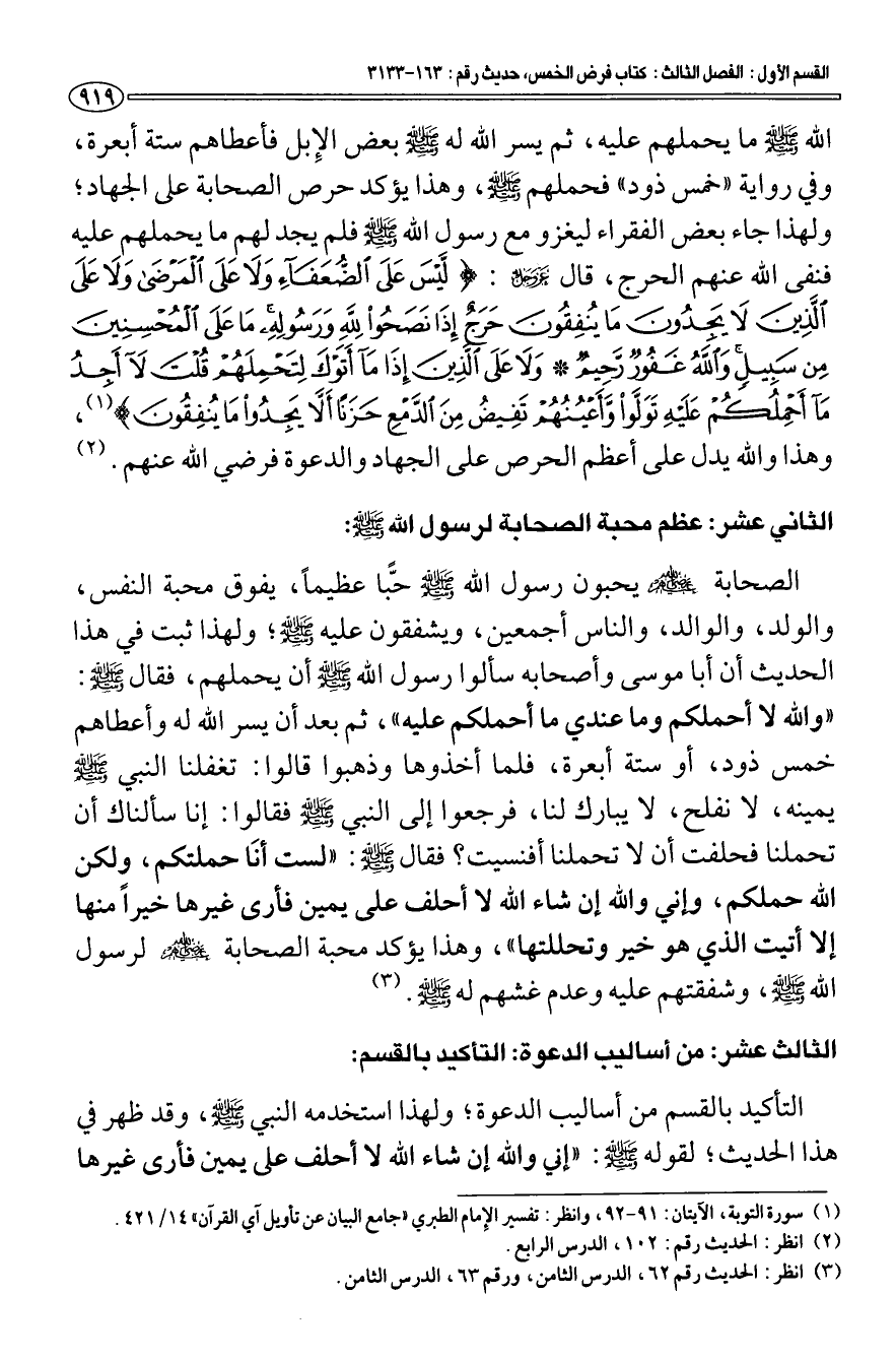 الله صلى الله عليه وسلم ما يحملهم عليه، ثم يسر الله له صلى الله عليه وسلم بعض الإبل فأعطاهم ستة أبعرة، وفي رواية "خمس ذود" فحملهم صلى الله عليه وسلم، وهذا يؤكد حرص الصحابة على الجهاد؛ ولهذا جاء بعض الفقراء ليغزو مع رسول الله صلى الله عليه وسلم فلم يجد لهم ما يحملهم عليه فنفى عنهم الحرج، قال عزّ وجلّ: {لَيْسَ عَلَى الضُّعَفَاءِ وَلَا عَلَى الْمَرْضَى وَلَا عَلَى الَّذِينَ لَا يَجِدُونَ مَا يُنْفِقُونَ حَرَجٌ إِذَا نَصَحُوا لِلَّهِ وَرَسُولِهِ مَا عَلَى الْمُحْسِنِينَ مِنْ سَبِيلٍ وَاللَّهُ غَفُورٌ رَحِيمٌ - وَلَا عَلَى الَّذِينَ إِذَا مَا أَتَوْكَ لِتَحْمِلَهُمْ قُلْتَ لَا أَجِدُ مَا أَحْمِلُكُمْ عَلَيْهِ تَوَلَّوْا وَأَعْيُنُهُمْ تَفِيضُ مِنَ الدَّمْعِ حَزَنًا أَلَّا يَجِدُوا مَا يُنْفِقُونَ} [التوبة: 91 - 92] (¬1) وهذا والله يدل على أعظم الحرص على الجهاد والدعوة فرضي الله عنهم (¬2).