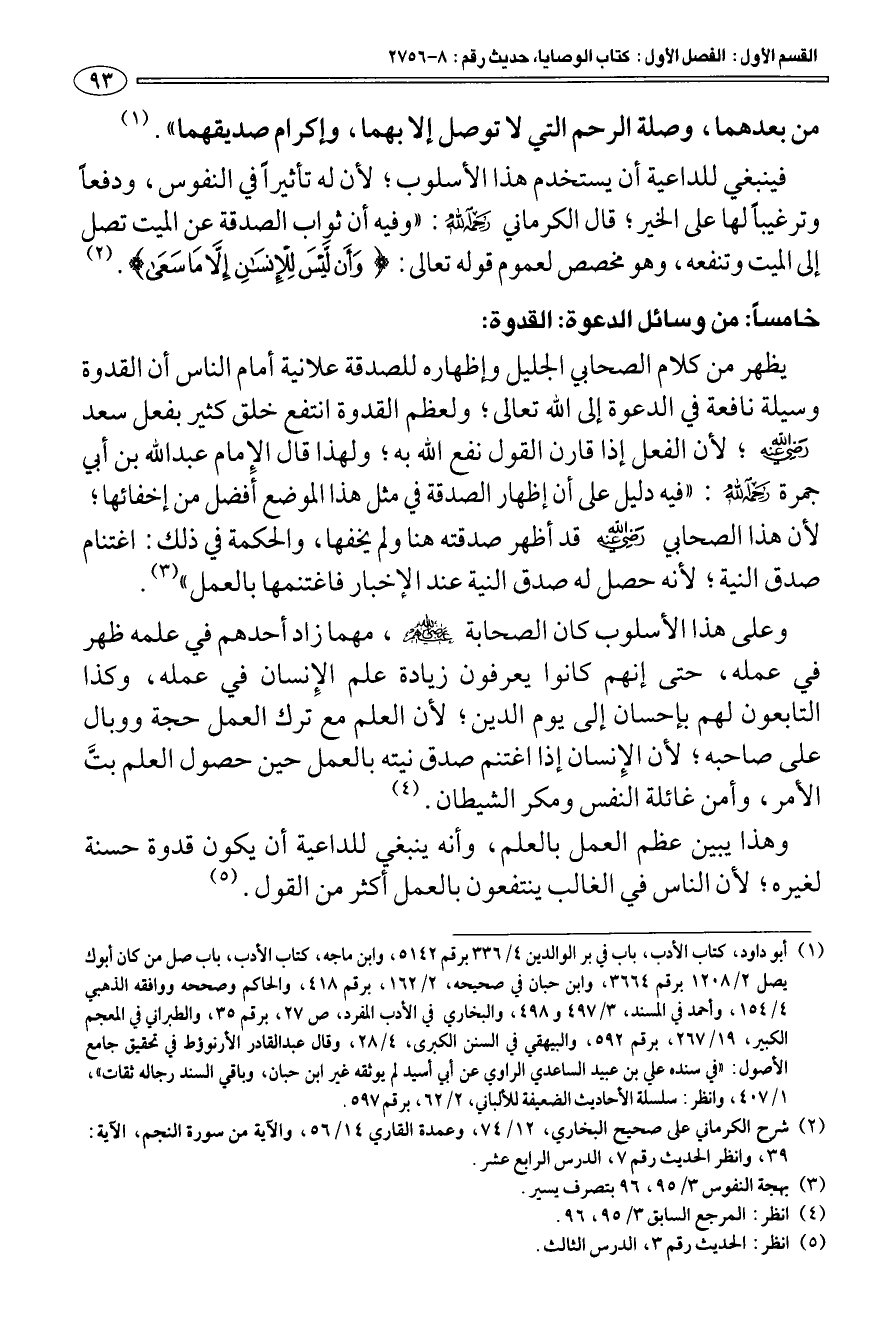 خامسا: من وسائل الدعوة: القدوة: يظهر من كلام الصحابي الجليل وإظهاره للصدقة علانية أمام الناس أن القدوة وسيلة نافعة في الدعوة إلى الله تعالى؛ ولعظم القدوة انتفع خلق كثير بفعل سعد رضي الله عنه؛ لأن الفعل إذا قارن القول نفع الله به؛ ولهذا قال الإمام عبد الله بن أبي جمرة رحمه الله: " فيه دليل على أن إظهار الصدقة في مثل هذا الموضع أفضل من إخفائها؛ لأن هذا الصحابي رضي الله عنه قد أظهر صدقته هنا ولم يخفها، والحكمة في ذلك: اغتنام صدق النية؛ لأنه حصل له صدق النية عند الإخبار فاغتنمها بالعمل " (¬3).