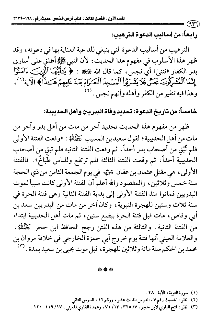 خامسا: من تاريخ الدعوة: تحديد وفاة البدريين وأهل الحديبية: ظهر من مفهوم هذا الحديث تحديد آخر من مات من أهل بدر وآخر من مات من أهل الحديبية؛ لقول سعيد بن المسيب رحمه الله: "وقعت الفتنة الأولى فلم تُبْقِ من أصحاب بدر أحدا، ثم وقعت الفتنة الثانية فلم تبقِ من أصحاب الحديبية أحدا، ثم وقعت الفتنة الثالثة فلم ترتفع وللناس طَبَاخ". فالفتنة الأولى، هي مقتل عثمان بن عفان رَضِيَ اللَّهُ عَنْهُ في يوم الجمعة الثامن من ذي الحجة سنة خمس وثلاثين، والمقصود والله أعلم أن الفتنة الأولى كانت سببا لموت البدريين فماتوا منذ الفتنة الأولى إلى بداية الفتنة الثانية وهي فتنة الحرة في سنة ثلاث وستين للهجرة النبوية، وكان آخر من مات من البدريين سعد بن أبي وقاص، مات قبل فتنة الحرة ببضع سنين، ثم مات أهل الحديبية ابتداء من الفتنة الثانية. والثالثة من هذه الفتن رجح الحافظ ابن حجر رحمه الله، والعلامة العيني أنها فتنة يوم خروج أبي حمزة الخارجي في خلافة مروان بن محمد بن الحكم سنة مائة وثلاثين للهجرة، قبل موت يحيى بن سعيد بمدة (¬3).