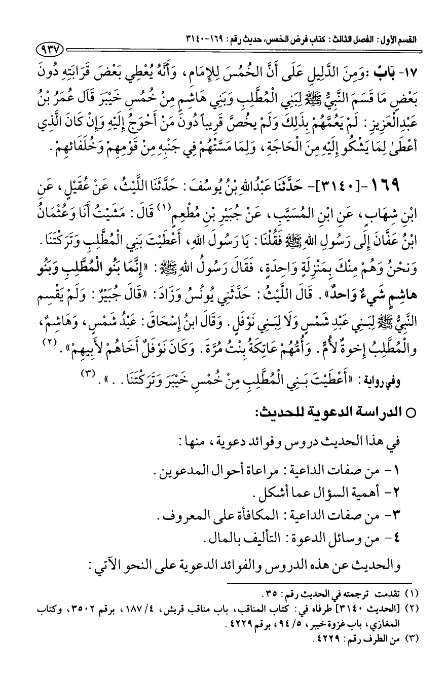 17 - باب وَمِنَ الدَّلِيلِ عَلَى أَنَّ الخُمُسَ لِلإِمَامِ، وأَنهُ يُعْطِي بعض قَرَابَتِهِ دُونَ بعض مَا قَسَمَ النَّبِيُّ صَلَّى اللهُ عَلَيْهِ وَسَلَّمَ لِبَنِي الْمُطَّلِبِ وَبَنِي هَاشِمٍ مِنْ خُمُسِ خَيْبَرَ قَال عُمَرُ بْنُ عبد العزيز: لَمْ يَعُمَّهُمْ بِذَلِكَ ولم يخص قريبا دُون مَنْ أحوج إَلَيْهِ وَإَنْ كان الَّذِي أعطى لما يشكو إليه من الحاجة، ولما مستهم في جنبه من قومه وخلفائهم.