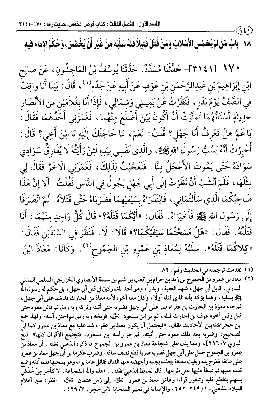 170 - [3141] حَدَّثَنَا مُسَدَّدٌ: حَدَّثَنَا يُوسُفُ بْنُ المَاجِشُونِ، عَنْ صالِحِ بْنِ إِبْرَاهِيمَ بْنِ عبد الرَّحْمَنِ بْنِ عَوْفٍ عَنْ أَبِيهِ عَنْ جَدِّه (¬1) «قَالَ: بَيْنَا أَنا واقِف في الصَّفِّ يَوْمَ بَدْرٍ، فَنَظَرْتُ عَنْ يَمِينِي وَشِمَالِي، فَإِذَا أَنا بِغُلامَيْنِ من الأنصَارِ حدِيثَةٍ أَسْنَانُهُمَا تَمَنَّيْتُ أَنْ أَكُونَ بَيْنَ أَضْلَعَ مِنْهُما، فَغَمَزَني أَحَدُهُمَا فَقَالَ: يَا عَمِّ هلْ تَعْرِفُ أَبَا جَهْلٍ؟ قُلْتُ: نَعَمْ، مَا حَاجَتُكَ إِلَيْهِ يَا ابْنَ أَخِي؟ قَالَ: أُخْبِرْتُ أَنهُ يَسُبُّ رَسُولَ الله صَلَّى اللهُ عَلَيْهِ وَسَلَّمَ، والَّذِي نَفْسِي بِيَدِه لَئِنْ رَأَيْتُهُ لَا يُفَارِقُ سَوَادِي سوَادَهُ حَتَّى يَمُوتَ الأَعْجَلُ مِنَّا. فَتَعَجَّبْتُ لِذَلِكَ، فَغَمَزنَي الآخَرُ فَقَالَ لِي مِثْلَهَا، فَلَمْ أنشَبْ أَنْ نَظَرْتُ إِلَى أَبِي جَهْلٍ يَجُولُ فِي النَّاس فَقُلْتُ: أَلَا إِنَّ هَذَا صَاحِبُكُمَا الَّذِي سَأَلتُمَانِي، فَابْتَدَرَاه بِسَيْفَيْهِمَا فَضَرَبَاهُ حَتَّى قَتَلاهُ. ثُمَّ انصَرَفَا إِلَى رَسُولِ الله صَلَّى اللهُ عَلَيْهِ وَسَلَّمَ فَأَخْبَرَاهُ. فَقَالَ: "أَيُّكُمَا قتلَهُ؟ " قَالَ كُلُّ وَاحِدٍ مِنْهُمَا: أَنا قَتَلْتُهُ. فَقَالَ: "هَلْ مَسَحْتُمَا سَيْفَيْكُمَا؟ " قَالَا: لَا. فَنَظَرَ فِي السَّيْفَيْنِ فَقَالَ: "كِلاكُمَا قتلَهُ". سلَبُهُ لِمُعَاذِ بْنِ عَمْرِو بْنِ الجَمُوحِ (¬2).
