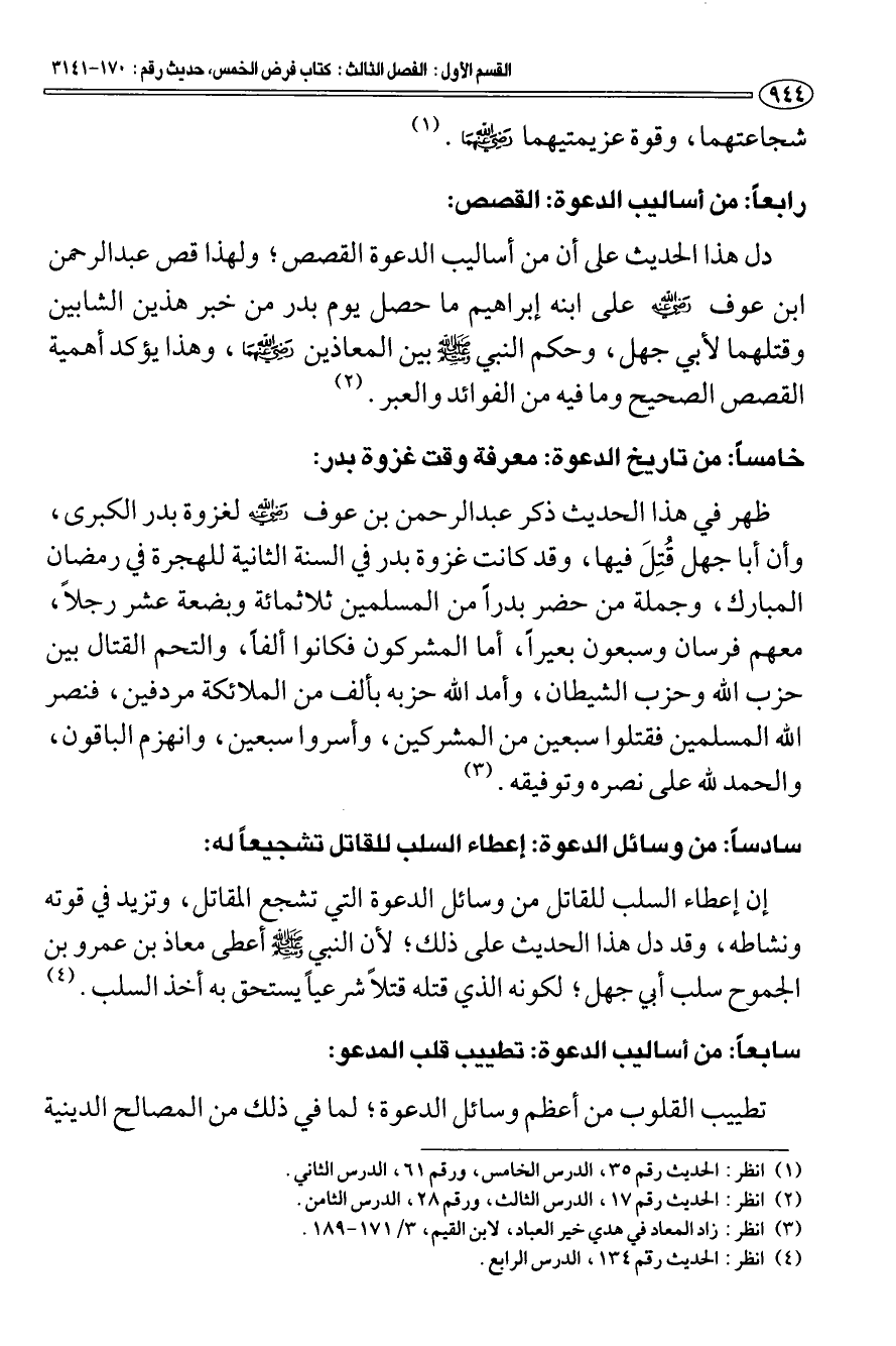 سادسا: من وسائل الدعوة: إعطاء السلب للقاتل تشجيعا له: إن إعطاء السلب للقاتل من وسائل الدعوة التي تشجع المقاتل، وتزيد في قوته ونشاطه، وقد دل هذا الحديث على ذلك؛ لأن النبي صَلَّى اللهُ عَلَيْهِ وَسَلَّمَ أعطى معاذ بن عمرو بن الجموح سلب أبي جهل؛ لكونه الذي قتله قتلا شرعيا يستحق به أخذ السلب (¬4).