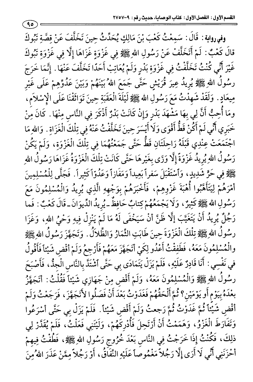 وفي رواية: قَالَ: «سَمِعْت كَعْبَ بْنَ مَالِكٍ يحَدِّث حِينَ تَخَلَّفَ عَنْ قِصَّةِ تَبوكَ قالَ كَعْب: لَمْ أَتَخَلَّفْ عَنْ رَسولِ اللهِ صلى الله عليه وسلم فِي غَزوَةٍ غَزَاهَا إِلَّا فِي غَزْوَةِ تَبوكَ غَير أني كنت تَخَلَّفْت فِي غَزْوَةِ بَدْرٍ ولم يعَاتِبْ أَحَدا تَخَلَّفَ عَنْهَا. إِنَّمَا خَرَجَ رسول اللهِ صلى الله عليه وسلم يرِيد عِيرَ قرَيْشٍ حَتَّى جَمَعَ الله بَيْنَهمْ وَبيْنَ عَدوِّهِمْ عَلَى غَيرِ ميعَادٍ. وَلَقَدْ شَهِدْت مَعَ رَسولِ الله صلى الله عليه وسلم لَيْلَةَ الْعَقَبَة حِينَ تَوَاثَقْنَا عَلَى الإسلام، ومَا أحِبّ أَنَّ لِي بِهَا مَشْهَدَ بَدْرٍ وَإِنْ كَانَتْ بَدْر أَذْكَرَ فِي النَّاسِ مِنْهَا. كَانَ مِنْ خَبَرِي أني لَمْ أَكنْ قَطّ أَقْوَى وَلَا أَيْسَرَ حِينَ تَخَلَّفْت عَنْه فِي تِلْكَ الْغَزَاةِ. وَاللهِ مَا اجتَمَعَتْ عِنْدِي قَبْلَه رَاحِلَتَانِ قَطّ حَتَّى جَمَعْتهمَا فِي تِلْكَ الْغَزْوَةِ، وَلَمْ يَكنْ رَسول اللهِ يرِيد غَزْوَة إِلَّا وَرَّى بِغَيْرهَا حَتَّى كَانَتْ تِلْكَ الْغَزْوَة غَزَاهَا رَسول اللهِ صلى الله عليه وسلم فِي حَرٍّ شَدِيدٍ، وَاسْتَقْبَل سَفرا بَعِيدا وَمَفَازا وَعَدوّا كَثِيرا. فَجَلَّى لِلْمسْلِمِينَ أمرَهم ليتأَهَّبوا أهْبَةَ غَزْوِهِمْ، فَأَخْبَرَهمْ بِوَجْههِ الَّذِي يرِيد وَالْمسْلِمونَ مَعَ رسولِ الله صلى الله عليه وسلم كثِير، وَلَا يَجْمَعهمْ كتاب حَافِظ - يرِيد الدِّيوَانَ- قَالَ كَعْب: فَما رَجل يرِيد أَنْ يَتَغَيَّبَ إلَّا ظَنَّ أنْ سَيَخْفَى لَه مَا لَمْ يَنْزِلْ فِيهِ وَحْي اللهِ، وَغَزَا رسول اللهِ صلى الله عليه وسلم تِلْكَ الْغَزْوَةَ حِينَ طَابَتِ الثِّمَار وَالظِّلاَل. وَتَجَهَّزَ رَسول اللهِ صلى الله عليه وسلم والمسْلِمونَ مَعَه، فَطَفِقْت أَعْدو لِكَيْ أتَجَهَّزَ مَعَهمْ فَأَرْجِع وَلَمْ أقْضِ شَيْئا فَأَقول في نَفْسِي: أَنا قَادِر عَلَيْهِ، فَلَمْ يَزَلْ يَتَمَادَى بِي حَتَّى اشْتَدَّ بِالنَّاسِ الجِدّ، فَأَصْبَحَ رسول اللهِ صلى الله عليه وسلم والْمسْلِمونَ مَعَه، وَلَمْ أَقْضِ مِنْ جَهَازِي شَيْئا فَقلْت: أتَجَهَّز بعْدَه بِيَوْمٍ أَو يومَينِ؟ ثم أَلْحَقهمْ فَغَدَوْت بَعْدَ أَنْ فَصَلوا لأتَجَهَّزَ، فَرَجَعْت وَلَمْ أقْضِ شَيْئا ثمَّ غَدَوْت ثمَّ رَجعت وَلَمْ أَقْضِ شَيْئا. فَلَمْ يَزَلْ بِي حَتَّى أسْرَعوا وَتَفَارَطَ الْغَزْو، وَهَمَمْت أَنْ أَرْتَحِلَ فَأدْرِكَهمْ، وَلَيْتَنِي فَعَلْت، فَلَمْ يقَدَّرْ لِي ذلِكَ، فكنْت إِذَا خَرَجْت فِي النَّاسِ بَعْدَ خروجِ رَسولِ اللهِ صلى الله عليه وسلم، فَطفْت فِيهِمْ أحزَنَنِي أنِّي لَا أَرَى إِلَّا رَجلا مَغْموصا عَلَيْهِ النِّفَاَق، أَوْ رَجلا مِمَّنْ عَذَرَ الله مِنَ