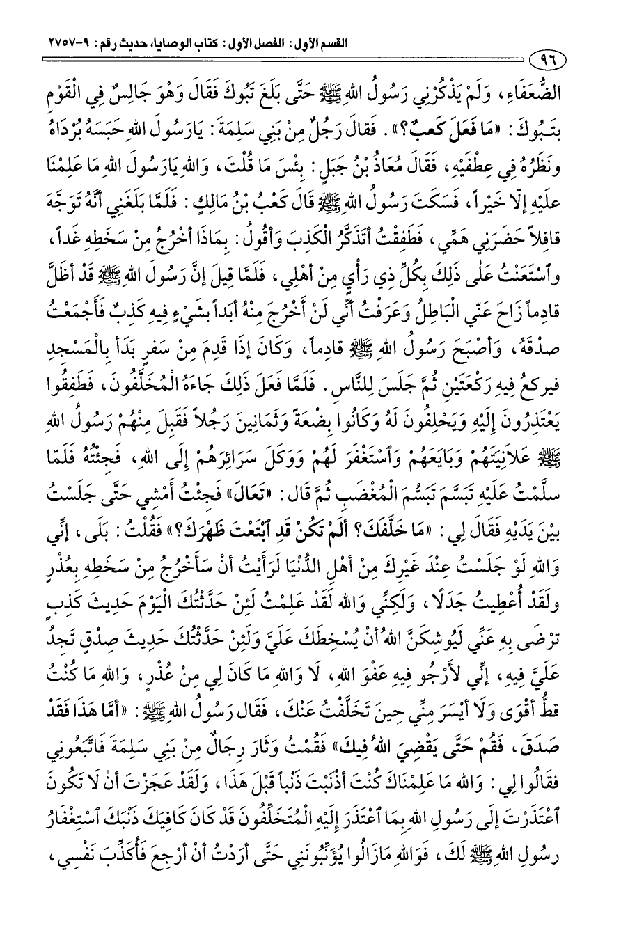 الضّعَفَاءِ، وَلَمْ يَذْكرْنِي رَسول اللهِ صلى الله عليه وسلم حتى بَلَغَ تَبوكَ فَقَالَ وَهْوَ جَالِس فِي الْقَوْم بتَبوكَ: " مَا فَعَلَ كَعب؟ ". فَقالَ رَجل مِنْ بَنِي سَلِمَةَ: يَا رَسولَ اللهِ حَبَسَه برْدَاه ونَظَره فِي عِطْفَيهِ، فَقَالَ معَاذ بْن جَبَلٍ: بِئْسَ مَا قلْتَ، وَاللهِ يَا رَسولَ اللهِ مَا عَلِمناَ علَيْهِ إلّا خَيْرا، فَسَكَتَ رَسول اللهِ صلى الله عليه وسلم قالَ كَعْب بْن مَالِكٍ: فَلَمَّا بَلَغَنِي أَنه تَوَجَّهَ قافِلا حَضَرنِي هَمِّي، فَطَفِقْت أتَذَكَّر الْكَذِبَ وَأقول: بِمَاذَا أخْرج مِنْ سَخَطِهِ غَدا، واسْتَعَنْت عَلى ذَلِكَ بِكلِّ ذِي رَأْيٍ مِنْ أهْلِي، فَلَمَّا قِيلَ إنَّ رَسولَ اللهِ صلى الله عليه وسلم قَدْ أظَلَّ قادِما زَاحَ عَنّي الْبَاطِل وَعَرَفْت أني لَنْ أَخْرجَ مِنْه أبَدا بشَيْءٍ فِيهِ كَذِب فَأَجْمَعْت صدْقَه، وَأصْبَحَ رَسول اللهِ صلى الله عليه وسلم قادِما، وَكَانَ إذَا قَدِمَ مِنْ سَفرٍ بَدَأ بِالْمَسْجِدِ فيركع فِيهِ رَكْعَتَيْنِ ثمَّ جَلَسَ لِلنَّاسِ. فَلَمَّا فَعَلَ ذَلِكَ جَاءَه الْمخَلَّفونَ، فَطَفِقوا يَعْتَذِرونَ إِلَيْهِ وَيَحْلِفونَ لَه وَكَانوا بِضْعَة وَثَمَانِينَ رَجلا فَقَبِلَ مِنْهمْ رَسول اللهِ صلى الله عليه وسلم عَلاَنِيَتَهمْ وَبَايَعَهمْ وَاسْتَغْفَرَ لَهمْ وَوَكَلَ سَرَائِرَهمْ إِلَى اللهِ، فجِئْته فَلَمّا سلَّمْت عَلَيْهِ تَبَسَّمَ تبَسّمَ الْمغْضَبِ ثمَّ قَال: " تَعَالَ " فَجِئْت أَمْشِي حَتَّى جَلَسْت بيْنَ يَدَيْهِ فَقَالَ لِي: " مَا خَلَّفَكَ؟ أَلَمْ تكنْ قَدِ ابْتَعْتَ ظَهْرَك؟ " فَقلْت: بَلَى، إنِّي وَاللهِ لَوْ جَلَسْت عِنْدَ غَيْرِكَ مِنْ أهْلِ الدّنْيَا لَرَأَيْت أنْ سَأَخْرج مِنْ سَخَطِهِ بِعذْرٍ ولَقَدْ أعْطِيت جَدَلا، وَلَكِنِّي وَالله لَقَدْ عَلِمْت لَئِنْ حَدَّثْتكَ الْيَوْمَ حَدِيثَ كَذِبٍ ترْضَى بِهِ عَنِّي لَيوشِكَنَّ الله أنْ يسْخِطَكَ عَلَيَّ وَلَئِنْ حَدَّثْتكَ حَدِيثَ صِدْقٍ تَجِد عَلَيَّ فِيهِ، إنِّي لأَرْجو فِيهِ عَفْوَ اللهِ، لَا وَاللهِ مَا كَانَ لِي مِنْ عذْرٍ، وَاللهِ مَا كنْت قطّ أقْوَى وَلَا أيْسَرَ مِنِّي حِينَ تَخَلَّفْت عَنْكَ، فَقَال رَسول اللهِ صلى الله عليه وسلم: " أمَّا هَذَا فَقَدْ صَدَقَ، فَقمْ حَتَّى يَقْضِيَ الله فِيكَ " فَقمْت وَثَارَ رِجَال مِنْ بَنِي سَلِمَةَ فَاتَّبَعوني فقَالوا لِي: وَالله مَا عَلِمْنَاكَ كنْتَ أذْنَبْتَ ذَنْبا قَبْلَ هَذَا، وَلَقَدْ عَجَزْتَ أنْ لَا تَكون اعْتَذَرْتَ إلَى رَسولِ اللهِ بِمَا اعْتَذَرَ إِلَيْهِ الْمتَخَلِّفونَ قد كَانَ كَافِيَكَ ذَنْبَكَ اسْتِغْفَار رسولِ اللهِ صلى الله عليه وسلم، فَوَاللهِ مَا زَالوا يؤَنِّبونَنِي حَتَّى أرَدْت أنْ أرْجِعَ فَأكَذِّبَ نَفْسِي،