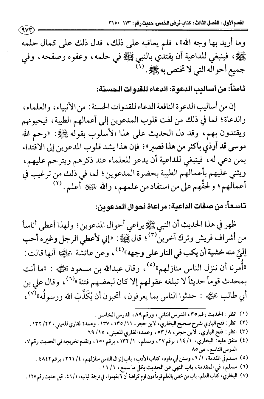 تاسعا: من صفات الداعية: مراعاة أحوال المدعوين: ظهر في هذا الحديث أن النبي صلى الله عليه وسلم يراعي أحوال المدعوين؛ ولهذا أعطى أناسا من أشراف قريش وترك آخرين (¬3) قال صلى الله عليه وسلم: «إني لأعطي الرجل وغيره أحب إلي منه خشية أن يكب في النار على وجهه» (¬4) وعن عائشة رضي الله عنها أنها قالت: «أمرنا أن ننزل الناس منازلهم» (¬5) وقال عبد الله بن مسعود رضي الله عنه: «ما أنت بمحدث قوما حديثا لا تبلغه عقولهم إلا كان لبعضهم فتنة» (¬6).