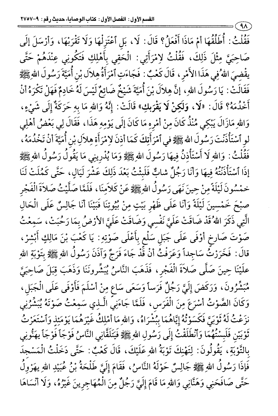 فَقلت: أطَلِّقهَا أمْ مَاذَا أَفْعَل؟ قَالَ: لَا، بَلِ اعْتَزِلْهَا وَلَا تَقْرَبْهَا، وَأرْسَلَ إلَى صَاحِبَيَّ مِثْلَ ذَلِكَ، فَقلْت لاِمْرَأَتِي: الْحَقِي بِأَهْلِكِ فَتَكوني عِنْدَهمْ حَتَّى يقْضِيَ الله فِي هَذَا الأَمْرِ، قَالَ كَعب: فَجَاءَتِ امْرَأَة هِلاَل بْنِ أمَيَّةَ رَسولَ اللهِ صلى الله عليه وسلم فَقَالَتْ: يَا رَسولَ اللهِ، إنَّ هِلاَلَ بنَ أمَيَّةَ شَيْخ ضَائِع لَيْسَ لَه خَادِم فَهَلْ تَكْرَه أنْ أَخْدمَه؟ قَالَ: " لَا، وَلَكِنْ لَا يَقْرَبكِ " قَالَتْ: إِنَّه وَاللهِ مَا بِهِ حَرَكَة إِلَى شَيْءٍ، وَاللهِ مَا زَالَ يَبْكِي منْذ كَانَ مِنْ أمْرِهِ مَا كَانَ إلَى يَوْمِهِ هَذَا، فَقَالَ لِي بَعْض أهْلِي لوِ اسْتَأْذَنْتَ رَسولَ الله صلى الله عليه وسلم في امْرَأَتِكَ كَمَا أذِنَ لاِمْرَأَةِ هِلاَلِ بْنِ أمَيَّةَ أنْ تَخْدمَه، فَقلْت: وَاللهِ لَا أَسْتَأْذِن فِيهَا رَسولَ اللهِ صلى الله عليه وسلم ومَا يدْرِينِي مَا يَقول رَسول اللهِ صلى الله عليه وسلم إذَا اسْتَأْذَنْته فِيهَا وَأنا رَجل شابّ فَلَبِثْت بَعْدَ ذَلِكَ عَشْرَ لَيَال، حَتَّى كَملَتْ لَنَا خمْسونَ لَيْلَة مِنْ حِينَ نَهَى رَسول اللهِ صلى الله عليه وسلم عَنْ كَلاَمِنَا، فَلَمَّا صَلَّيْت صَلاَةَ الْفَجْرِ صبْحَ خَمْسِينَ لَيْلَة وَأنا عَلَى ظَهْرِ بَيْتٍ مِنْ بيوتِنَا فَبَيْنَا أنا جَالِس عَلَى الْحَالِ الَّتِي ذَكَرَ الله قَدْ ضَاقَتْ عَلَيَّ نَفْسِي وَضَاقَتْ عَلَيَّ الأرْض بِمَا رَحبَتْ، سَمِعْت صَوْتَ صَارخٍ أوْفَى عَلَى جَبَلِ سَلْعٍ بِأَعْلَى صَوْتِهِ: يَا كَعْبَ بْنَ مَالِكٍ أَبْشِرْ، قالَ: فَخَرَرْت سَاجِدا وَعَرَفْت أنْ قَدْ جَاءَ فَرَج وآذَنَ رَسول اللهِ صلى الله عليه وسلم بتَوْبَة اللهِ علَيْنَا حِينَ صَلَّى صَلاَةَ الْفَجْرِ، فَذَهَبَ النَّاس يبَشِّرونَنَا وَذَهَبَ قِبَلَ صَاحِبَيَّ مبَشِّرونَ، وَرَكَضَ إِلَيَّ رَجل فَرَسا وَسَعَى سَاعٍ مِنْ أسْلَمَ فَأَوْفَى عَلَى الْجَبَلِ، وَكَانَ الصَّوْت أسْرَعَ مِنَ الْفَرَسِ، فَلَمَّا جَاءَنِي الَّذِي سَمِعْت صَوْتَه يبَشِّرنِي نزَعْت لَه ثَوْبَيَّ فَكَسَوْته إِيَّاهمَا بِبشْرَاه، وَاللهِ مَا أمْلِك غَيْرَهمَا يَوْمَئِذٍ واسْتَعَرْت ثَوْبَيْنِ فَلَبِسْتهمَا وانطَلَقْت إِلَى رَسولِ اللهِ صلى الله عليه وسلم فَيَتَلَقَّانِي النَّاس فَوْجَا فَوْجَا يهنئوني بِالتَّوْبَة، يَقولونَ: لِتَهْنِكَ تَوْبَة اللهِ عَلَيْكَ، قَالَ كَعْب: حَتَّى دَخَلْت المَسْجِد فَإذَا رَسول اللهِ صلى الله عليه وسلم جالِس حَوْلَه النَّاس، فَقَامَ إِلَيَّ طلحَة بْن عبَيْدِ اللهِ يهَرْوِل حَتَّى صَافَحَنِي وَهَنَّأنِي وَاللهِ مَا قَامَ إِلَيَّ رَجل مِنَ الْمهَاجِرِينَ غَيْره، وَلَا أنْسَاهَا